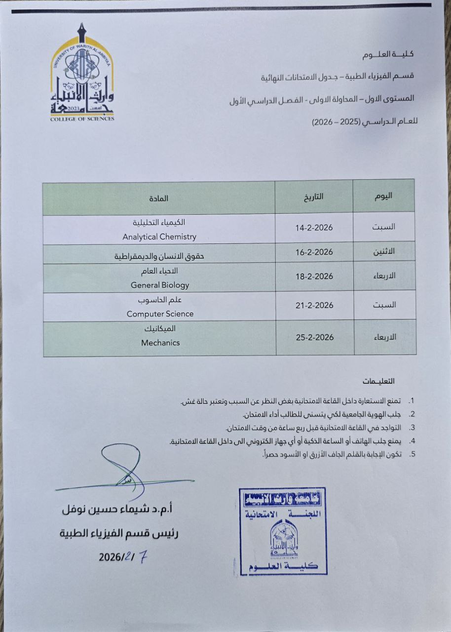 جدول الامتحانات النهائية لكلية الإدارة والاقتصاد للعام الدراسي 2025-2026 الكورس الأول وفق مسار بولونيا- المرحلة الأولى
