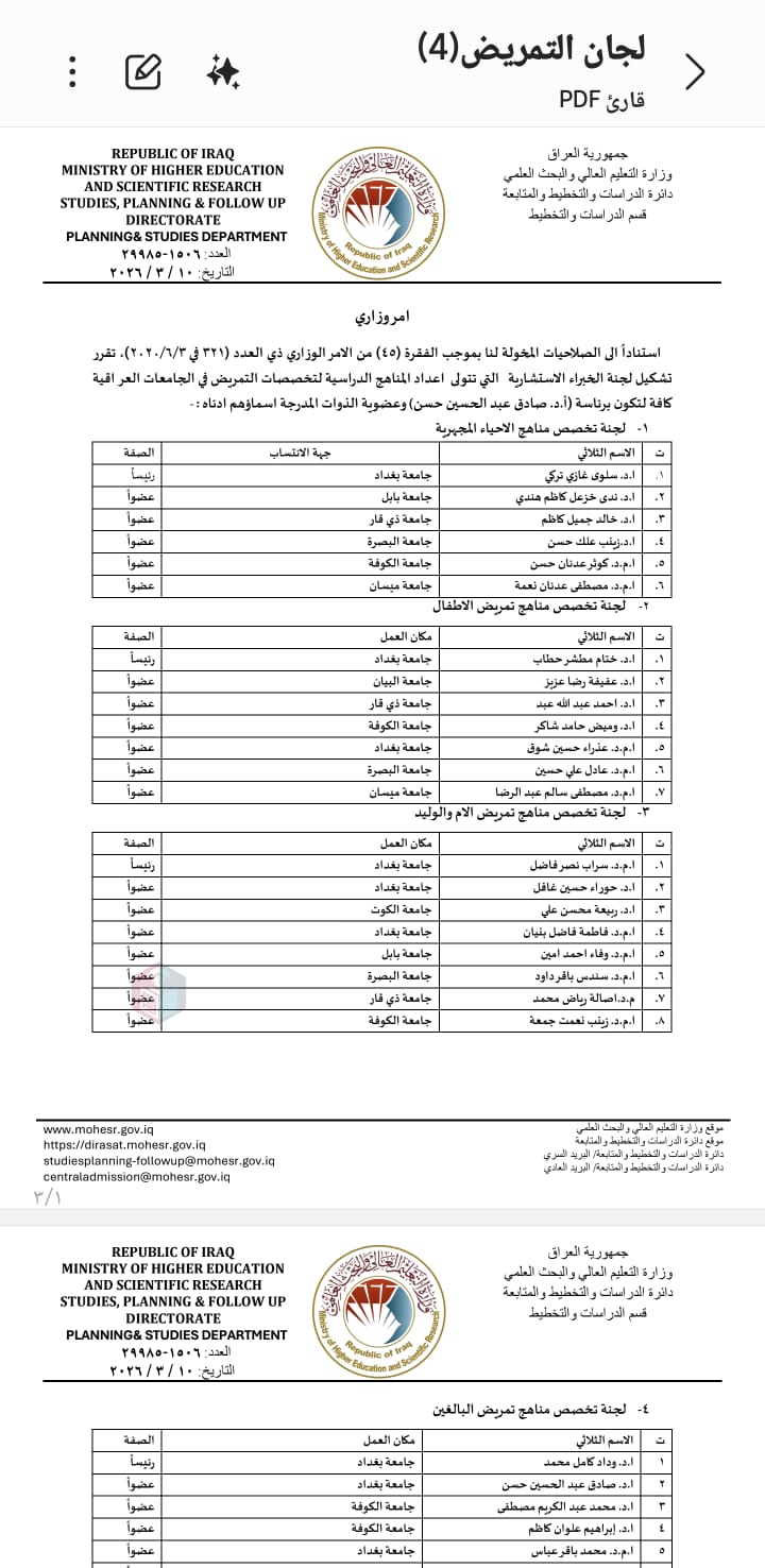 وتتولى اللجنة مهام إعداد وتحديث وتطوير المناهج الدراسية لتخصصات التمريض في الجامعات العراقية، بما ينسجم مع متطلبات التطور العلمي وحاجة سوق العمل، وبما يسهم في تعزيز جودة المخرجات التعليمية.