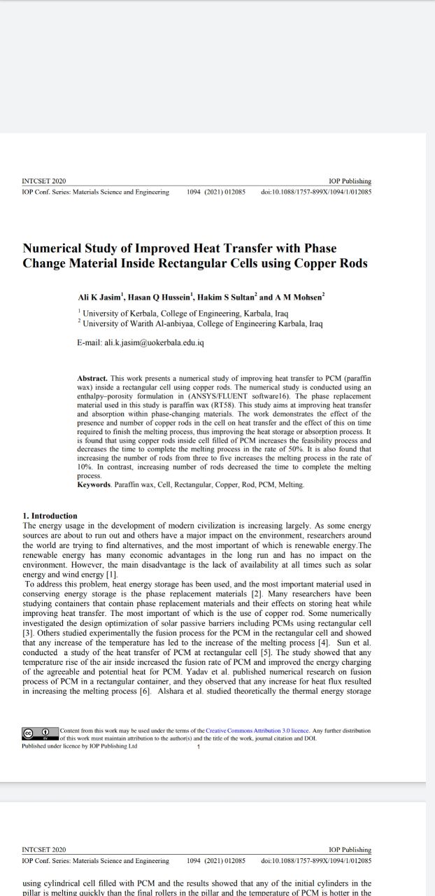 تهدف هذه الدراسة إلى تحسين نقل الحرارة وامتصاصها داخل المواد المتغيرة الطور ، ويوضح العمل تأثير وجود عدد من قضبان النحاس في الخلية على انتقال الحرارة وتأثير ذلك في الوقت المطلوب لإنهاء عملية الذوبان ، وبالتالي تحسين عملية تخزين الحرارة أو الامتصاص.