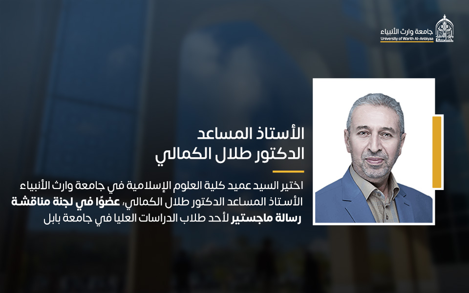 اختير السيد عميد كلية العلوم الإسلامية في جامعة وارث الأنبياء (عليه السلام)، الأستاذ المساعد الدكتور طلال الكمالي، عضوًا في لجنة مناقشة رسالة ماجستير لأحد طلاب الدراسات العليا في كلية العلوم الإسلامية بجامعة بابل.