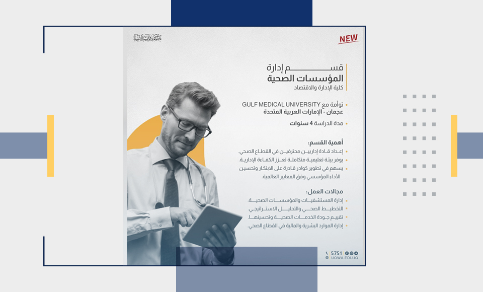 قسم إدارة المؤسسات الصحية في كلية الإدارة والاقتصاد – جامعة وارث الأنبياء (عليه السلام) يؤهّلك لتكون جزءاً من قيادة النظام الصحي الحديث في البلاد