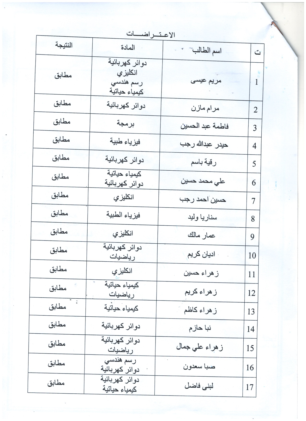الى طلبة قسم الهندسة الطب الحياتي بعد تدقيق كافة الاعتراضات المقدمة كانت جميع النتائج مطابقة حسب الجدول ادناة