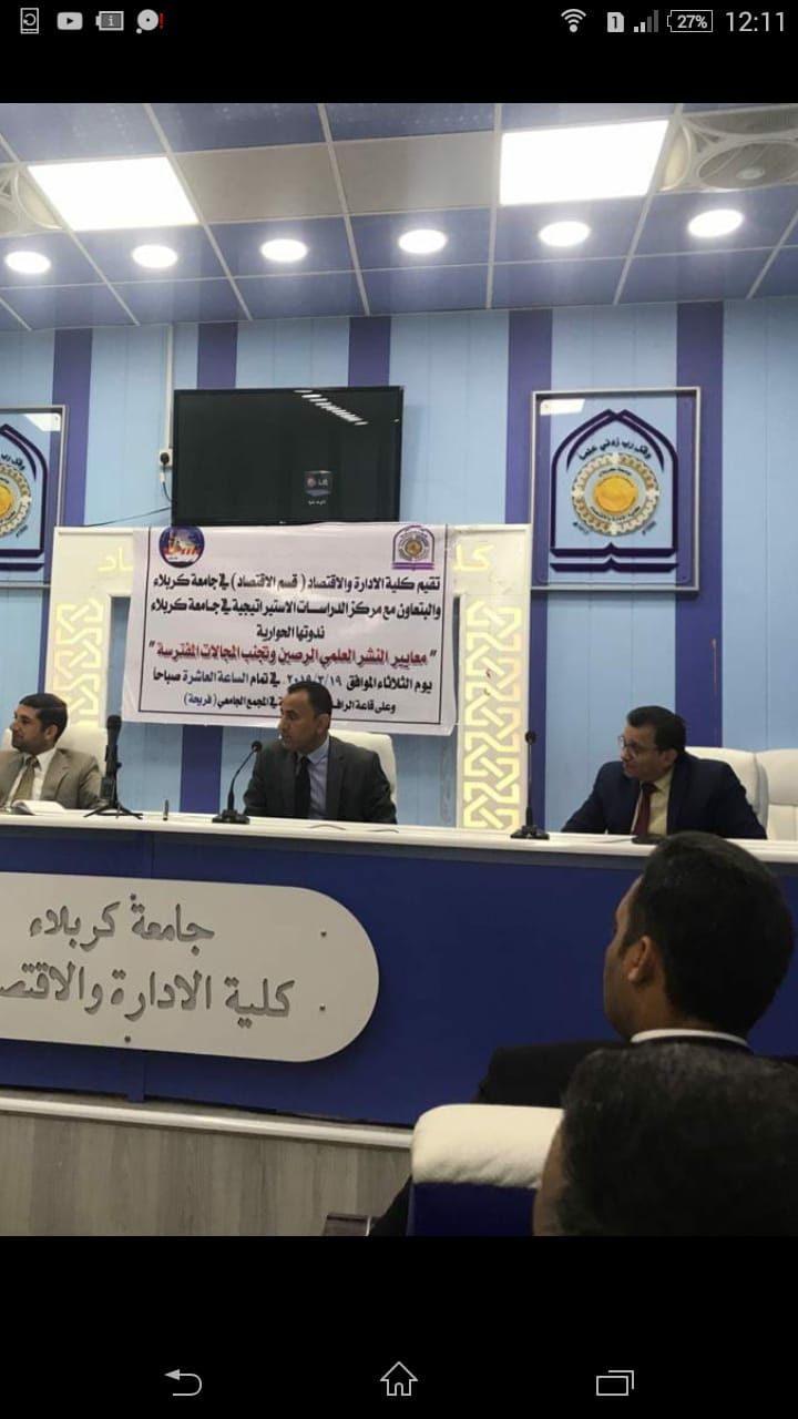 2019/03/28شارك الدكتور حاكم سماوي الجبوري رئيس قسم هندسة الكييف والتبريد بحلقة حوارية في جامعة كربلاء حول البحث العلمي والنشر في المجلات الرصين وتجنب النشر في المجلات المفترسة... حيث عرض الدكتور حاكم اهم معايير النشر العلمي الرصين وكيفية معرفة قواعد البيانات العالمية ودور النشر مثل تومسون رويتر وسكوباس... وفي نهاية الحلقة تمت الاجابة عن بعض الاستفسارات من قبل الحضور... وقد شكر المنظمين الدكتور حاكم على اسلوبه الشيق في الطرح العلمي... وقدمت له شهادة تقديرية من قبل مركز الدراسات الستراتيجية في جامعة كربلاء