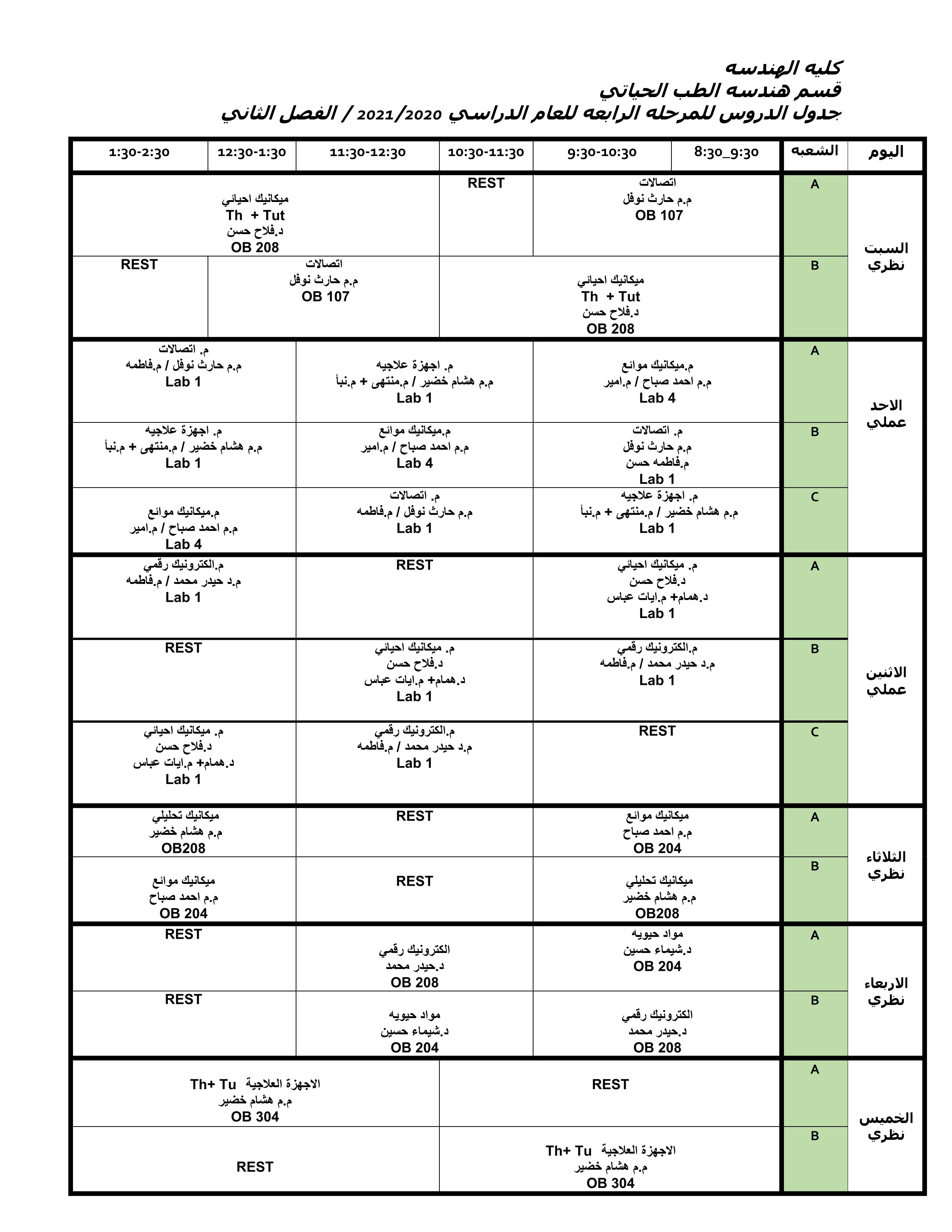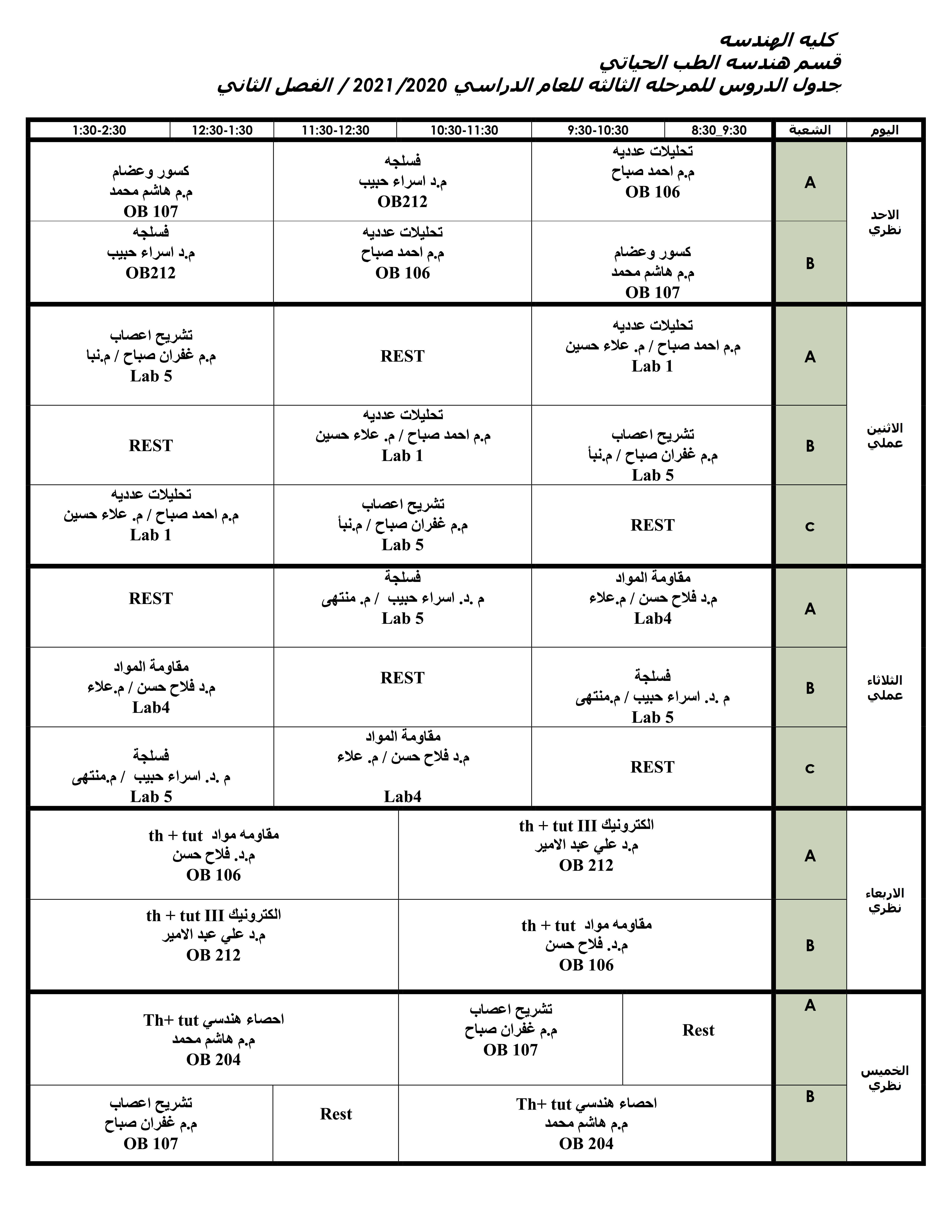 جدو الدروس الاسبوعي لقسم هندسة الطب الحياتي