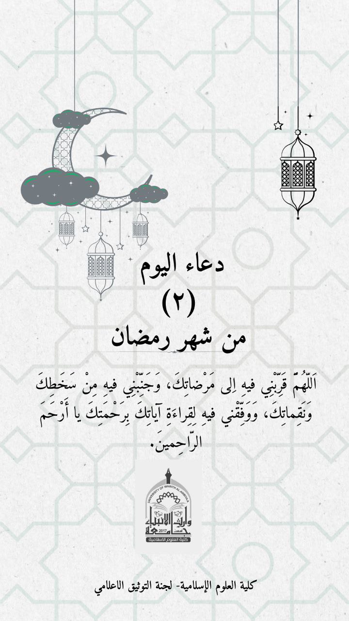 اَللّهُمَّ قَرِّبْنِي فيهِ اِلى مَرْضاتِكَ، وَجَنِّبْنِي فيهِ مِنْ سَخَطِكَ وَنَقِماتِكَ، وَوَفِّقْني فيهِ لِقِراءَةِ آياتِكَ بِرَحْمَتِكَ يا أَرْحَمَ الرّاحِمينَ.