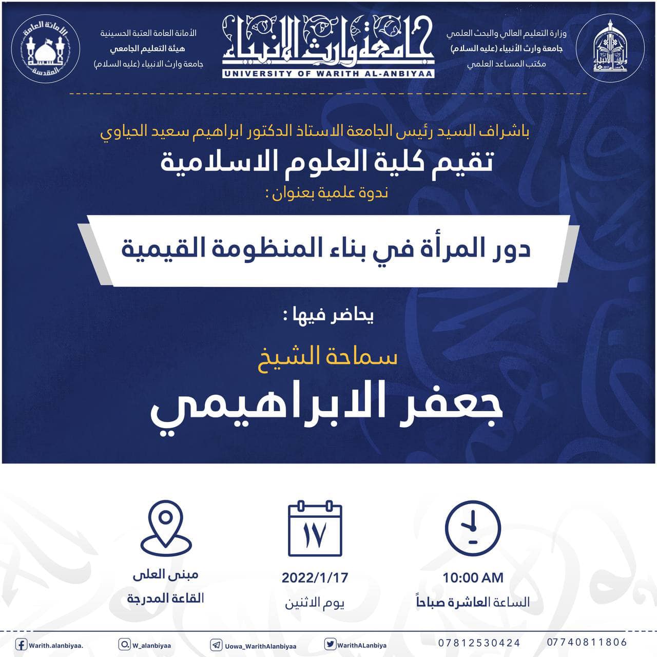 تحت اشراف رئاسة جامعة وارث الانبياء (عليه السلام) تقيم كلية العلوم الاسلامية ندوة علمية بعنوان (دور المرأة في بناء المنظومة القيمية) يحاضر فيها سماحة الشيخ جعفر الابراهيمي وذلك في تمام العاشرة من صباح يوم الاثنين الموافق 17-1-2022 ، على القاعة المدرجة في بناية العلى.