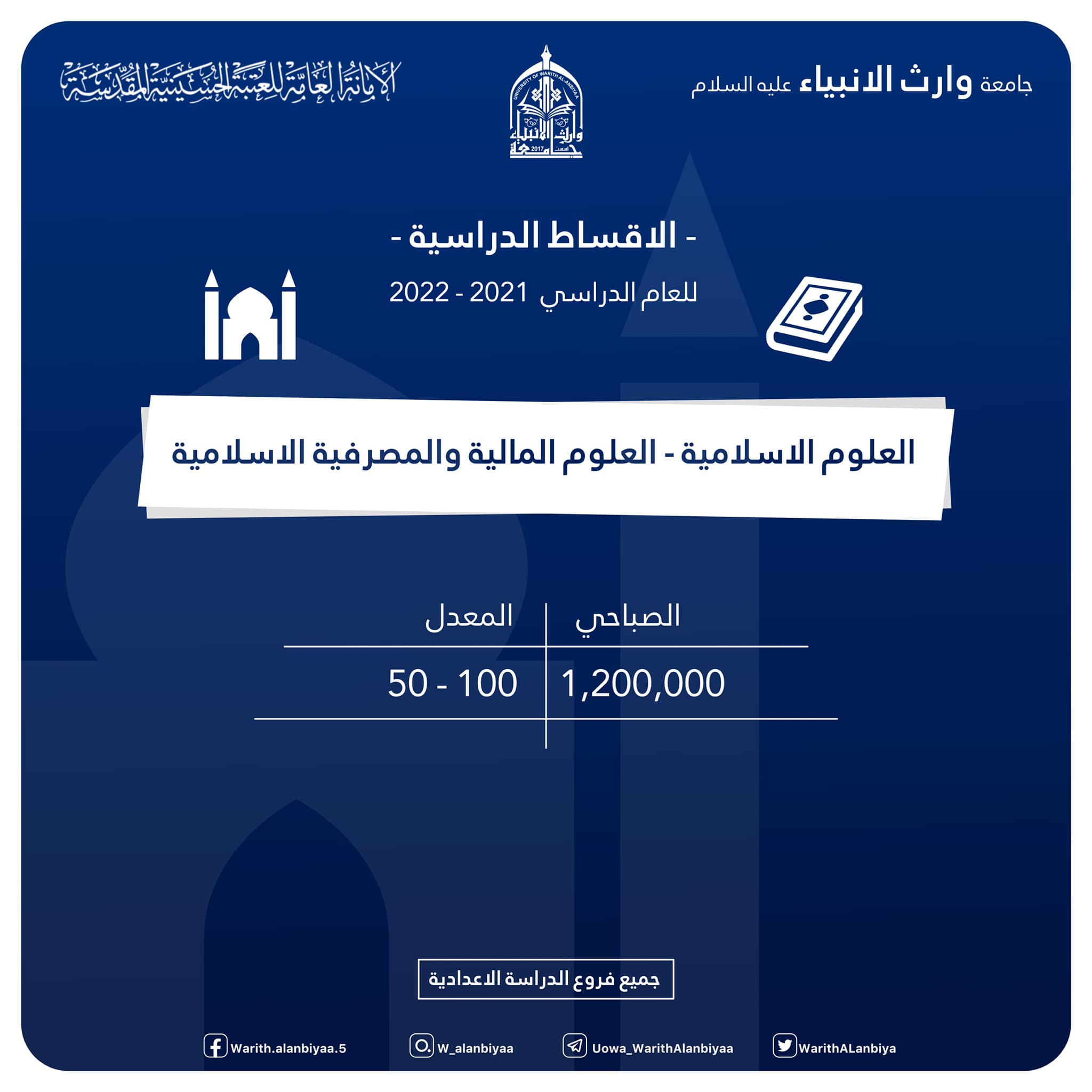 اليكم اقسام الكلية :قسم علوم القران-قسم الفقه واصوله -قسم العلوم المالية والمصرفية الاسلامية الحد الادنى للقبول 50فرع الدراسة الإعدادية - تطبيقي-علمي -احيائي-الاعدادية القرآنية-اعداديات الوقف الشيعي نوع الدراسة-صباحي -مسائيالأقساط الدراسية -حسب المعدل*قسم العلوم المالية والمصرفية الاسلامية (صباحي فقط) يقبل القسم خريجي / احيائي + تطبيقي + علمي + ادبي + وخريجي مراكزالتدريب المهني الذي تكون مدة الدراسة فيها ثلاث سنوات الطلبة الذين أدوا الامتحان الوزاري في الاختصاص المناظر+ الاعداديات الاسلامية التابعة للتربية(صباحي ومسائي) + الاعداديات الاسلامية التابعة للوقفين (الدراسة الصباحية طلبة الدراسة الخارجية (من أدو الامتحان التقويمي فقط))+ معهد اعداد معلمين (قسم الدراسة الاسلامية ، قسم اللغةالعربية)*التعيين للطلبة الاوائل على (الكلية واقسامها)في مؤسسات العتبة الحسينية المقدسة.