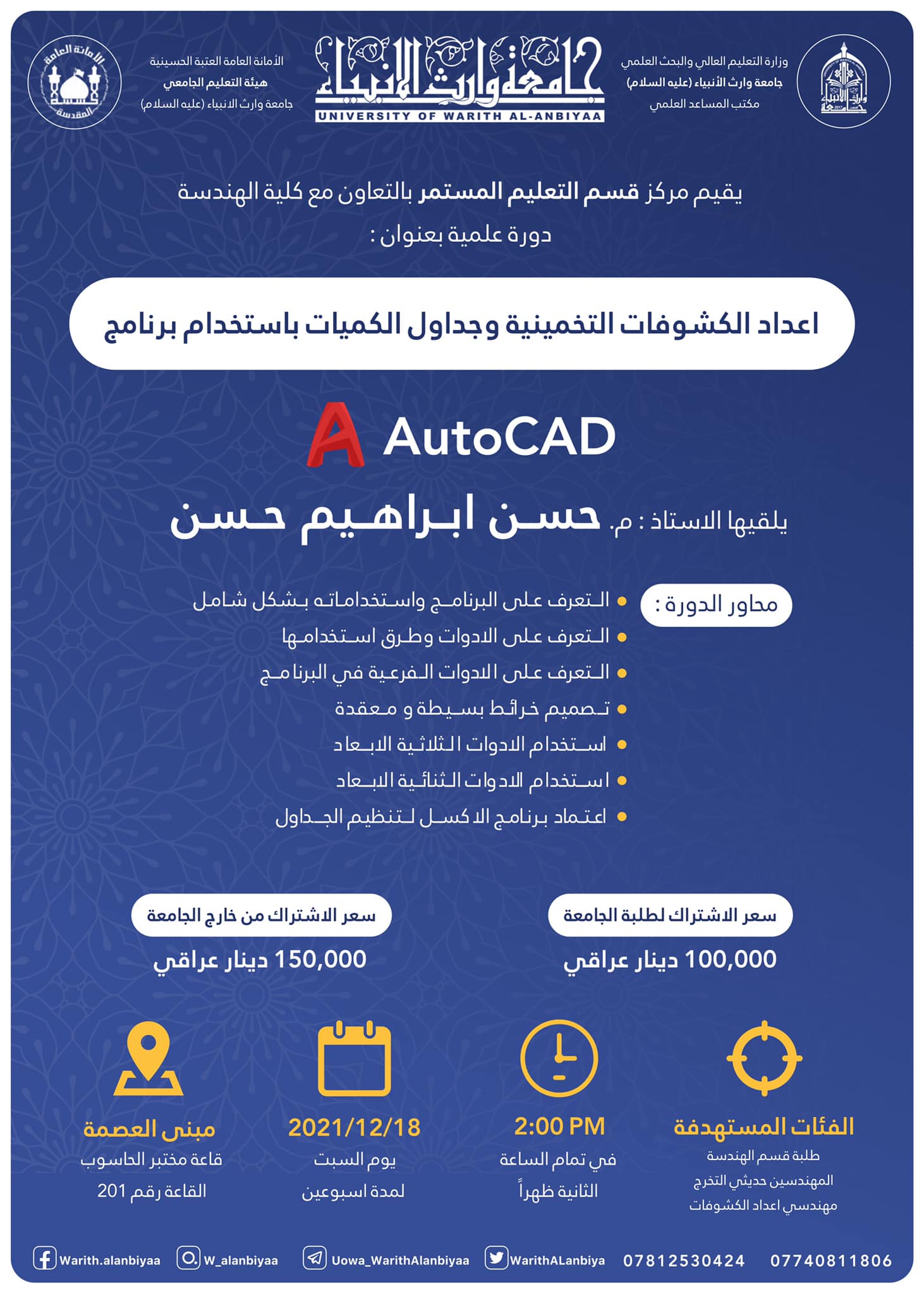يهديكم مركز التعليم المستمر في جامعة وارث الأنبياء (عليه السلام) اطيب التحيات و نود اعلام حضراتكم عن اقامة المركز دورة تدريبية تخصصية هندسية بعنوان (اعداد الكشوفات التخمينية وجداول الكميات باستخدام البرنامج الهندسي AutoCAD ). والتي ستعقد ابتداءً من يوم السبت الموافق 2021/12/218 ولمدة ثمانية ايام.تلقى الدورة حضوريا في رحاب جامعة وارث الانبياء (عليه السلام) - بناية العصمة/مختبر الحاسوب / رقم القاعة (201) في تمام الساعة (2:00) ظهرا.
