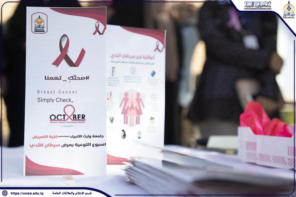 على هامش الحملة التوعوية التي اقامتها كلية التمريض داخل اروقة الجامعة وبالتعاون مع جامعة الزهراء(عليها السلام)للبنات اقامت الكلية ندوة علمية توعوية بمخاطر هذا المرض وقالت محاضرة الندوة المدرس زهراء الثابت: ارتكزت محاور الندوه على التعريف بالمرض عوامل الخطر والمسببات وكذلك الاعراض والعلامات التي تنذر بحصوله واهمية التوعية بطرق وكيفية الفحص المبكر والتي أهمها هو الفحص الذاتي فضلاً عن اتباع نظام للتغذية السليمة لتجنب الإصابة بهكذا امراضواضافت الثابت: نحن نبحث في إمكانية عقد إتفاقيات تعاون مع المؤسسات الصحية ذات العلاقه والتابعه للعتبه الحسينية المقدسة لتوفير فحوصات مجانية وبشكل شهري للحد من انتشار هذا المرض.