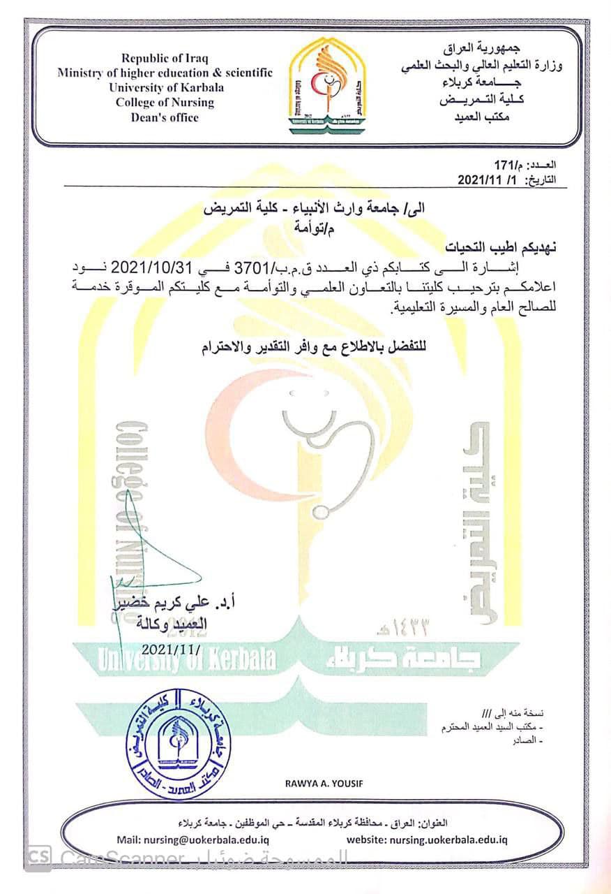 في إطار التعاون العلمي الأكاديمي المتبادل، وقعت كلية التمريض في جامعة وارث الأنبياء(عليه السلام)، صباح الأحد، توأمة علمية مع نظيرتها في جامعة كربلاء.جاء هذا القرار إثر اجتماع موسع ضم كلاً من السيد عميد كلية التمريض في جامعة وارث الأنبياء(عليه السلام) أ.م.د.مرتضى غانم الجبوري ونظيره أ.د.علي كريم الجبوري عميد كلية التمريض في جامعة كربلاء.وناقش الطرفان بنود اتفاق التوأمة ومدى أهميتها في تبادل الخبرات عبر كتابة البحوث العلمية المشتركة وعقد المؤتمرات والندوات بما يخدم المصلحة العامة ويسهم في دعم وتطوير العملية التعليمية كلتا الجامعتين. ويشار إلى أن التوأمة جاءت تطبيقاً لكتاب وزارة التعليم العالي والبحث العلمي والمنصوص على إجراء توأمة علمية مع كلية نظيرة ضمن الرقعة الجغرافية لإجراء الامتحان التقويمي.