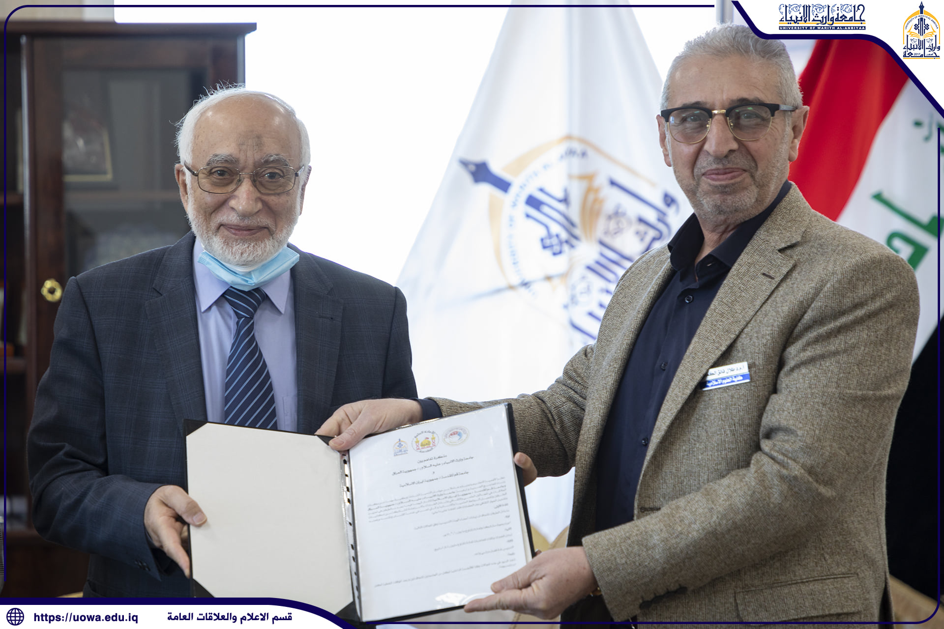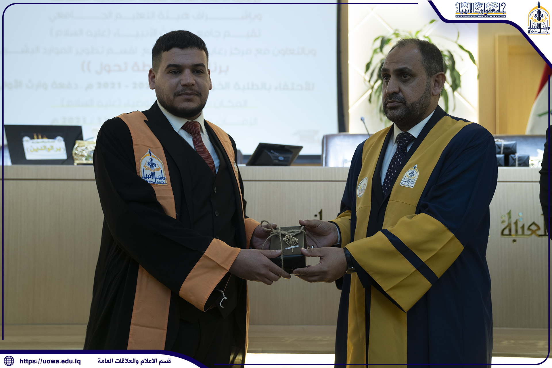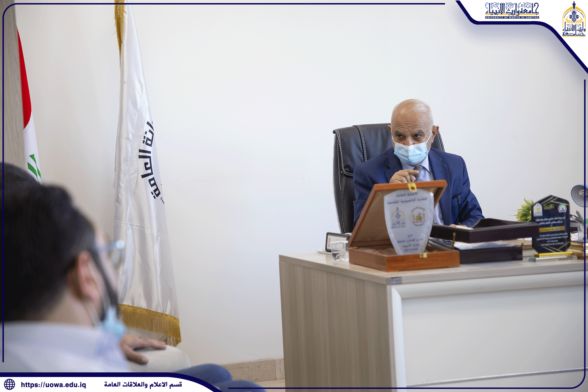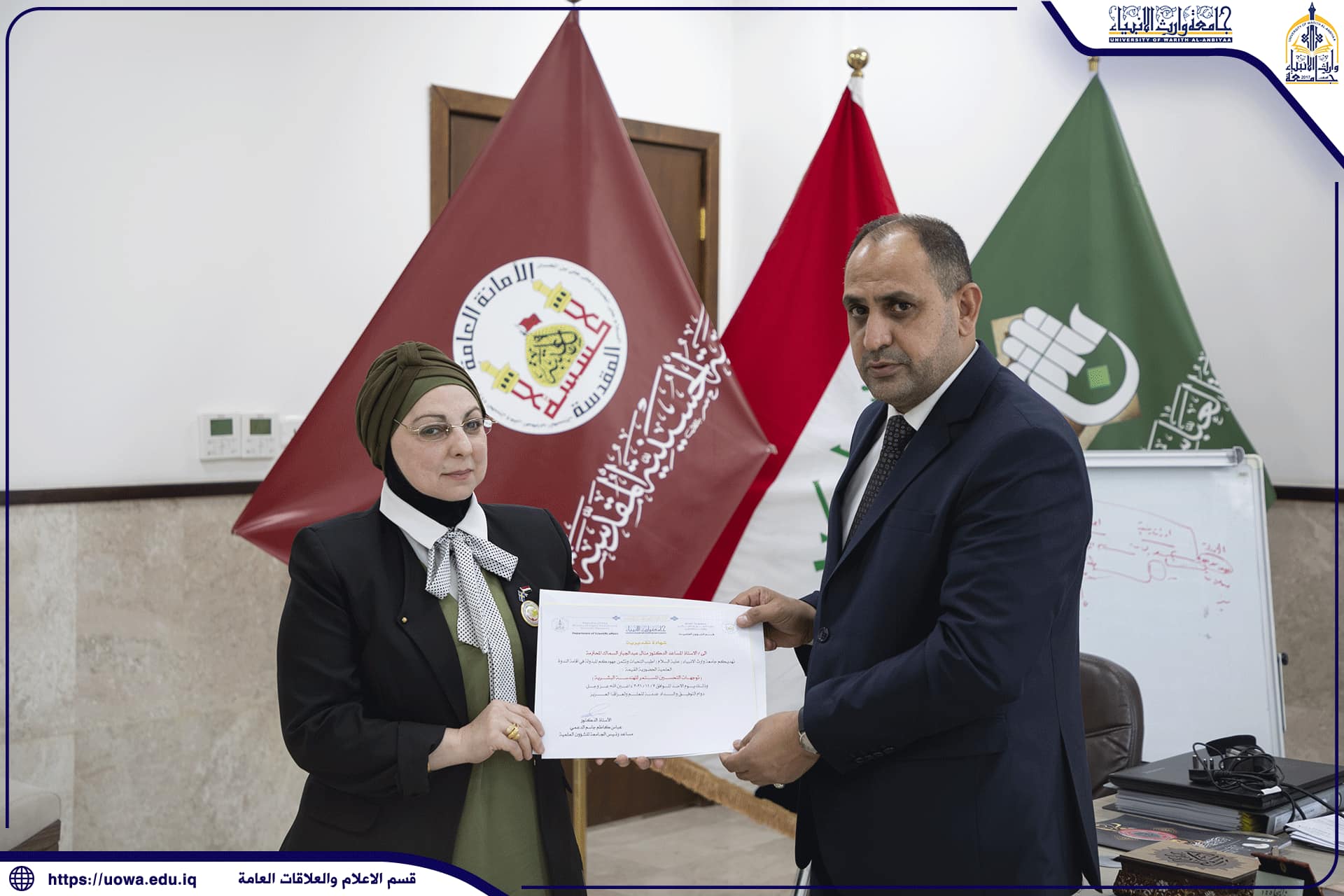كرم المتولي الشرعي للعتبة الحسينية سماحة الشيخ عبد المهدي الكربلائي(دام عزه) الاستاذ الدكتور طالب حسن موسى الموسوي يوم السبت ٣٠ / ١٠ / ٢٠٢١ والمصادف ٢٢ / ربيع الأول ١٤٤٣ (هج) تثمينا لجهوده المبذولة في ادارة الجامعة والتزامه بنهج المرجعية الرشيدة مع مايفرضه عليه قانون التعليم العالي الاهلي وخلال فترتها التأسيسية فكان اول رئيس لها وما حققته الجامعة من احراز مكانة علمية اكاديمية مرموقة محليا وعالميا وجرى التكريم في مكتب سماحته في العتبة الحسينية المقدسة اذ حضر التكريم سماحة الأمين العام للعتبة الحسينية المقدسة جناب السيد جعفر الموسوي دامت توفيقاته و السيد الدكتور افضل الشامي رئيس هيئة التعليم الجامعي في العتبة الحسينية المقدسة وجناب الحاج حسن رشيد جواد نائب الأمين العام للعتبة المباركة كما حضر التكريم جناب رئيسة جامعة الزهراء(عليها السلام) للبنات التابعة للعتبة المقدسة مع الكادر المتقدم والاخوة العمداء فيها و الاستاذ الدكتور المساعد الإداري والأستاذ الدكتور المساعد العلمي والسادة عمداء الكليات في جامعة وارث الانبياء (عليه السلام )،والقى سماحة المتولي الشرعي كلمة بين فيها اسباب التكريم وكذلك سماحة الأمين العام اضافة الى الاخوة الذين حضروا التكريم ثم تشرف رئيس الجامعة بتسلم وثيقة مطبوعة وموقعة من سماحتيهما تتضمن الدعاء والشكر والتقدير لرئيس الجامعة اضافة الى الهدايا الرمزية وان رئيس الجامعة القى كلمة خاطب فيها مولانا ابي عبد الحسين (عليه السلام) مسلما عليه وعلى أخيه ابي الفضل العباس (عليه السلام) شاكرا هذا التكريم المبارك ومقدرا له كل التقدير.