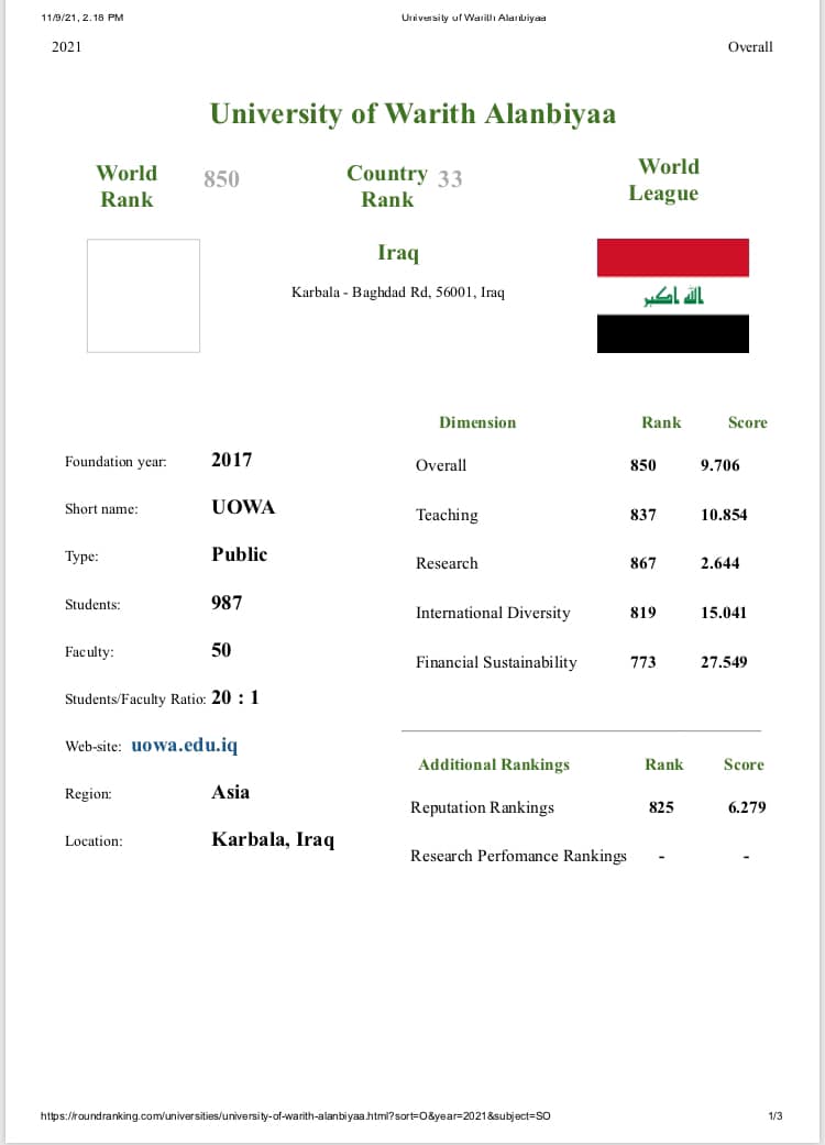 بتوفيق من الله تعالى وبجهود العاملين في الجامعة وباشراف السيد رئيس الجامعة الاستاذ الدكتور طالب حسن الموسوي وبمتابعة مباشرة من قبل السيد المساعد العلمي الاستاذ الدكتور عباس الدعمي دخلت جامعة وارث الأنبياء(عليه السلام) التصنيف العالمي RUR الروسي ولأول مرة وحصولها على المرتبة 850 عالميا و33 محليا من أصل 52 جامعة أهلية وحكومية و6 من أصل 21 جامعة اهلية، اذ يتضمن التصنيف مؤشرات عن جودة التعليم بنسبة 40% والبحث العلمي بنسبة 40% والتنوع الثقافي 10% والاستدامة المالية 10%يذكر ان جامعة وارث الانبياء(عليه السلام) تسعى للدخول والتقدم في التصنيفات العالمية المهمة التي من شأنها الارتقاء بالعملية التعليمية في بلدنا العزيز وهذا ما تطمح اليه العتبة الحسينية المقدسة من خلال تبنيها مشروع الجامعات