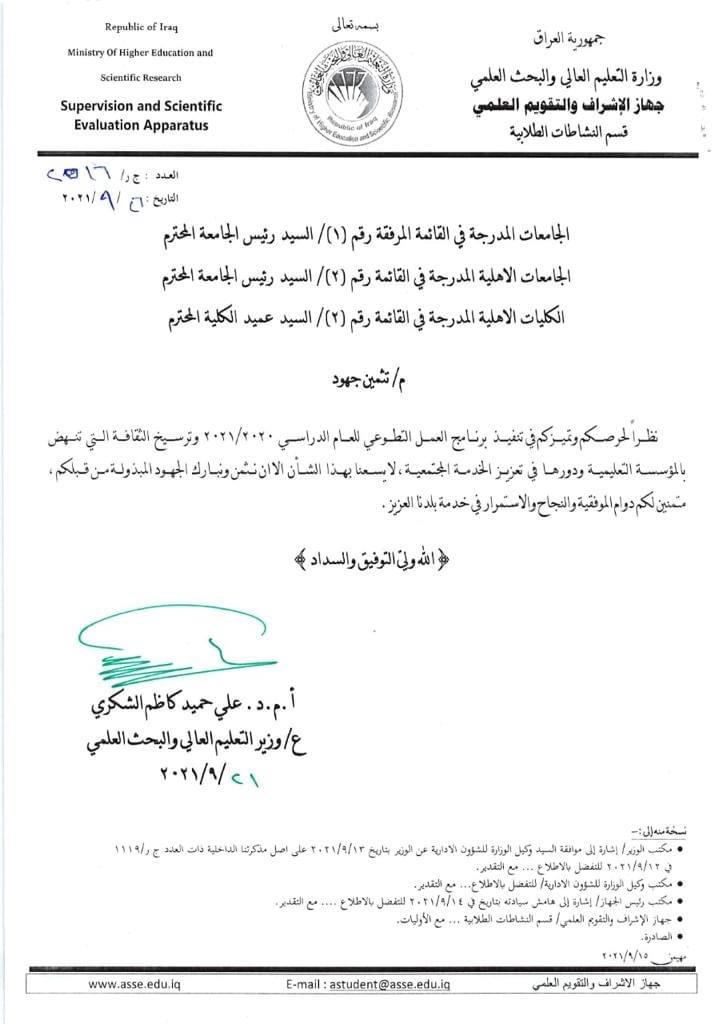 ثمن وزير التعليم العالي والبحث العلمي الاستاذ الدكتور نبيل كاظم عبد الصاحب جهود جامعة وارث الانبياء(عليه السلام) على حرصها وتميزها في تنفيذ برنامج العمل التطوعي وترسيخ هذه الثقافة التي تنهض بالمؤسسات التعليمة متمنين دوام الموفقية والنجاح خدمة لبلدنا العزيز.يذكر ان جامعة وارث الانبياء(عليه السلام) دابت ومنذ السنة الاولى لتاسيسها على تقديم الخدمات المجتمعية المختلفة من خلال تسخير طاقاتها الاكاديمية في خدمة المجتمع في مدينة كربلاء المقدسة