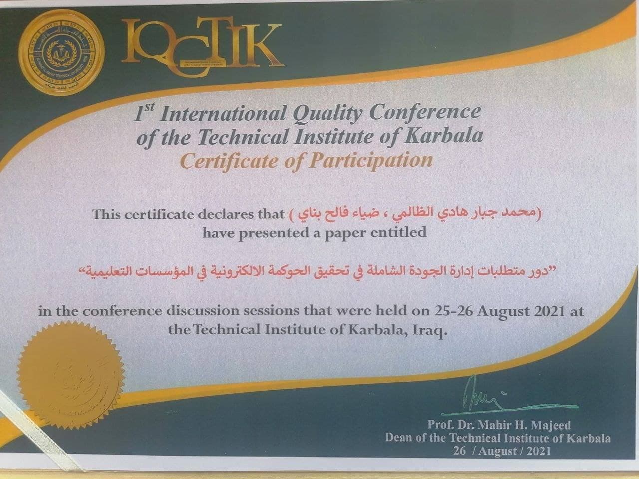 شارك الباحث والأكاديمي في كلية الادارة والاقتصاد في جامعة وارث الانبياء (عليه السلام) الدكتور ضياء البناي في الموتمر الدولي الاول للجودة الذي اقامه المعهد التقني في كربلاء المقدسة ، اذ تمثلت المشاركة ببحث علمي حمل عنوان (دور متطلبات إدارة الجودة الشاملة في تحقيق الحوكمة الالكترونية في المؤسسات التعليمية)، وعن موضوع البحث تحدث الدكتور ضياء البناي قائلاً :