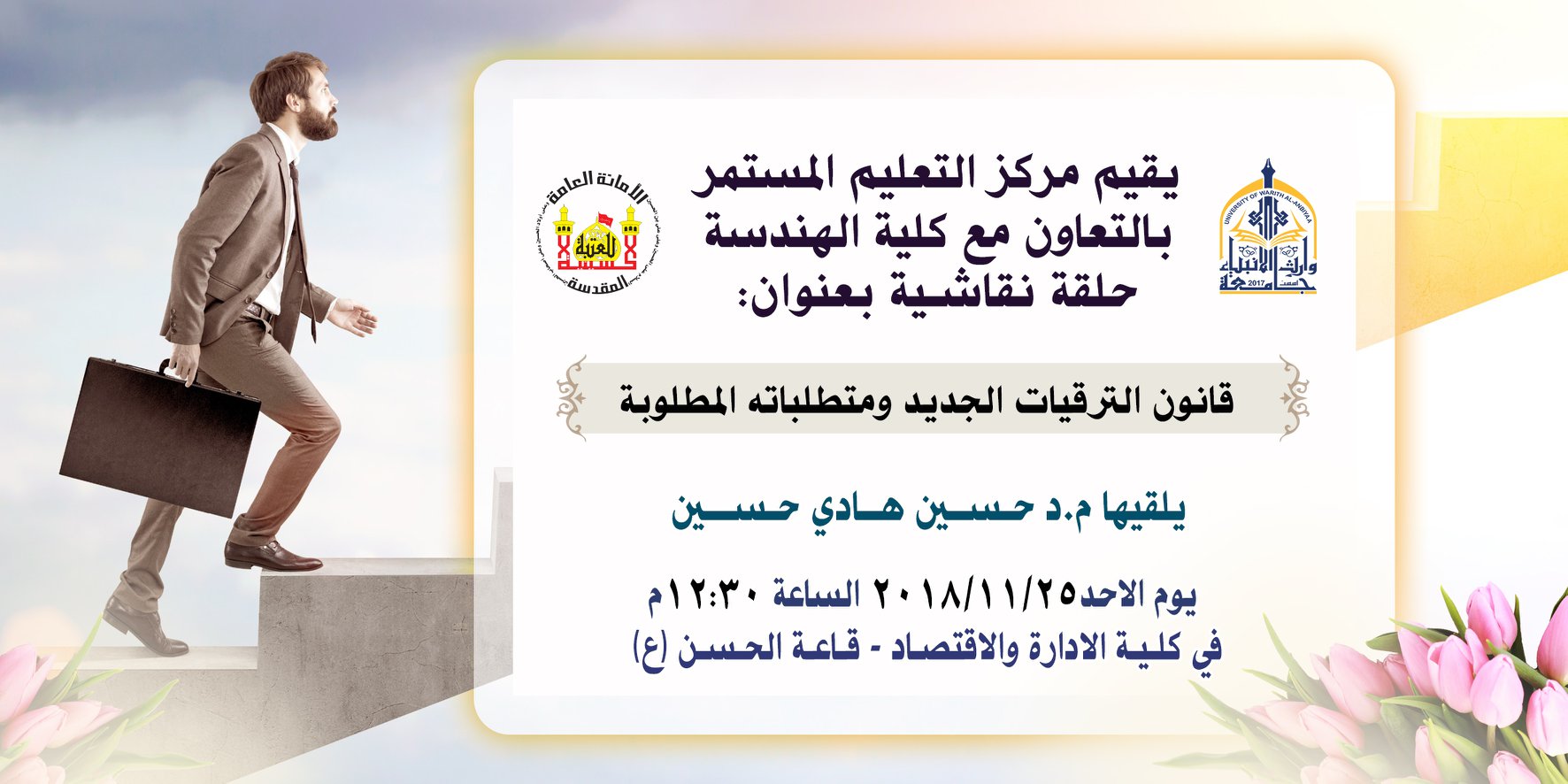#جامعة_وارث_الانبياء_التابعة_للعتبة_الحسينية_المقدسة تعقد ندوة علمية بعنوان (التقييم الخارجي للمناهج الدراسية) القاها الأستاذ الدكتور حسن النجم مسؤول قسم تطوير المواد الأنشائية في جامعة ليفربول جون موريس في بريطانيا وكان الهدف من الندوة النهوض بالبرنامج التعليمي على مستوى جامعتنا وكذلك امكانية الإتفاق على عمل توأمة لجامعتنا مع الجامعات البريطانية اذ بين الدّكتور ان مفهوم التوأمة هو نقل المعارف وتعزيز التضامن الأكاديمي بين الجامعات في شتى أنحاءالعالم ,وأضاف أنه على تواصل مستمر مع الجامعة وهناك خطوات تحضيرية معها لأعداد خطط استراتيجية بالأعتماد على التجارب العالمية وخاصة في جامعة جون موريس البريطانية حيث تتلخص في تطوير الأداء العلمي الذي يسهم في الأرتقاء بالجامعة الى مصاف الجامعات العالمية.
