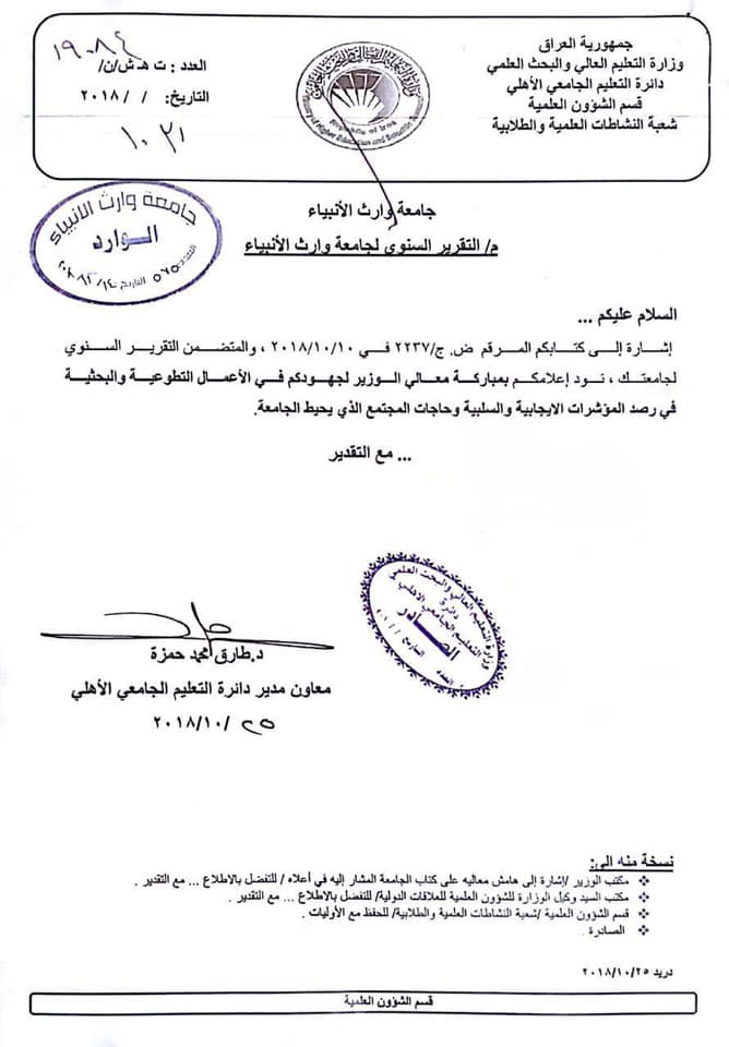 بارك السيد وزير التعليم العالي والبحث العلمي وعن لسان معاون مدير دائرة التعليم الجامعي الأهلي جهود #جامعة_وارث_الأنبياء_التابعة_للعتبة_الحسينية_المقدسة في الأعمال التطوعية والبحثية في رصد المؤشرات الإيجابية والسلبية وحاجة المجتمع الذي يحيط بالجامعة ، حيث ويذكر أن الجامعة لها عدد من النشاطات التطوعية والخدمية للمجتمع في محافظة كربلاء المقدسة
