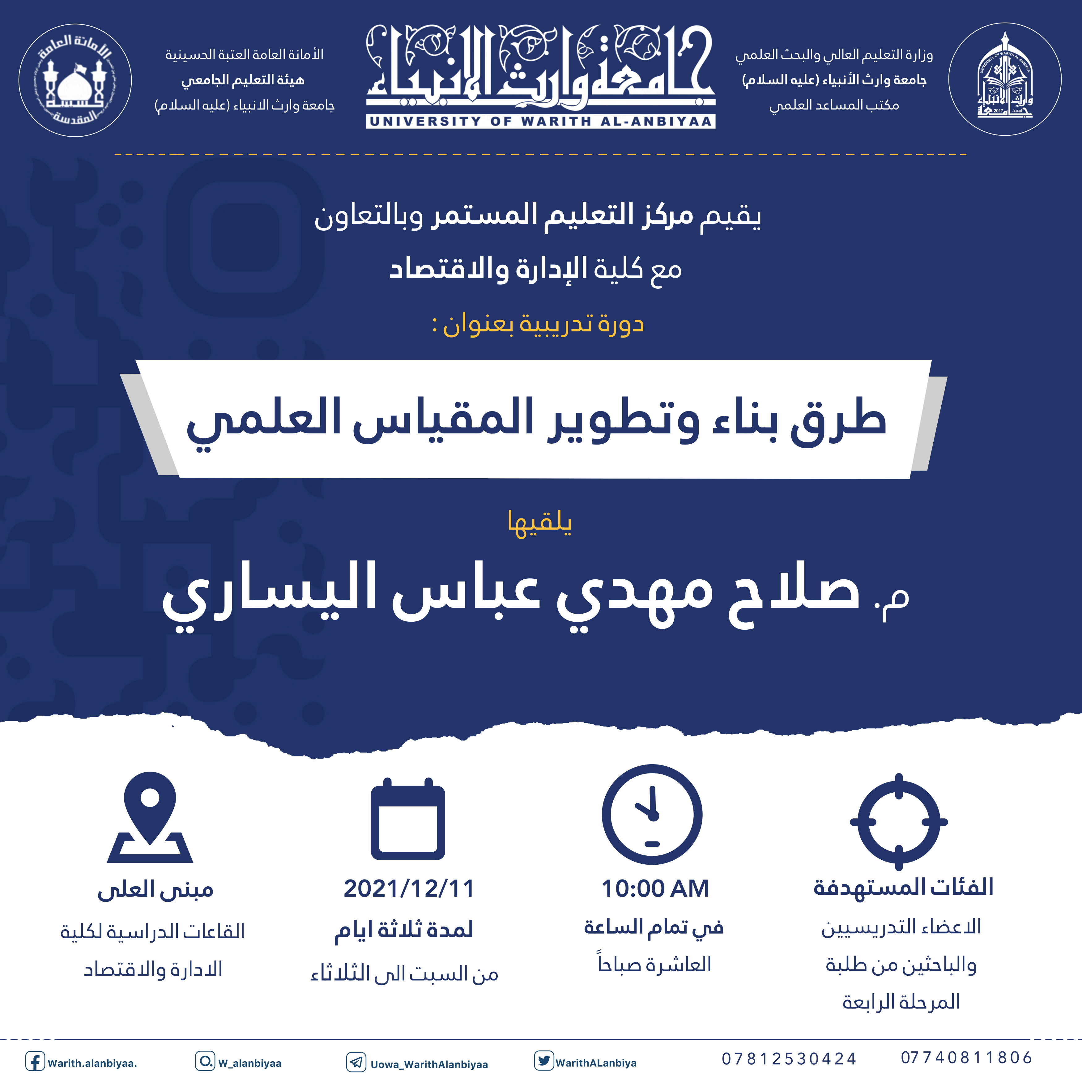 يهديكم مركز التعليم المستمر في جامعة وارث الأنبياء (عليه السلام) اطيب التحيات و نود اعلام حضراتكم عن اقامة المركز دورة تدريبية تخصصية هندسية بعنوان (اعداد الكشوفات التخمينية وجداول الكميات باستخدام البرنامج الهندسي AutoCAD ). والتي ستعقد ابتداءً من يوم السبت الموافق 2021/12/218 ولمدة ثمانية ايام.تلقى الدورة حضوريا في رحاب جامعة وارث الانبياء (عليه السلام) - بناية العصمة/مختبر الحاسوب / رقم القاعة (201) في تمام الساعة (2:00) ظهرا.