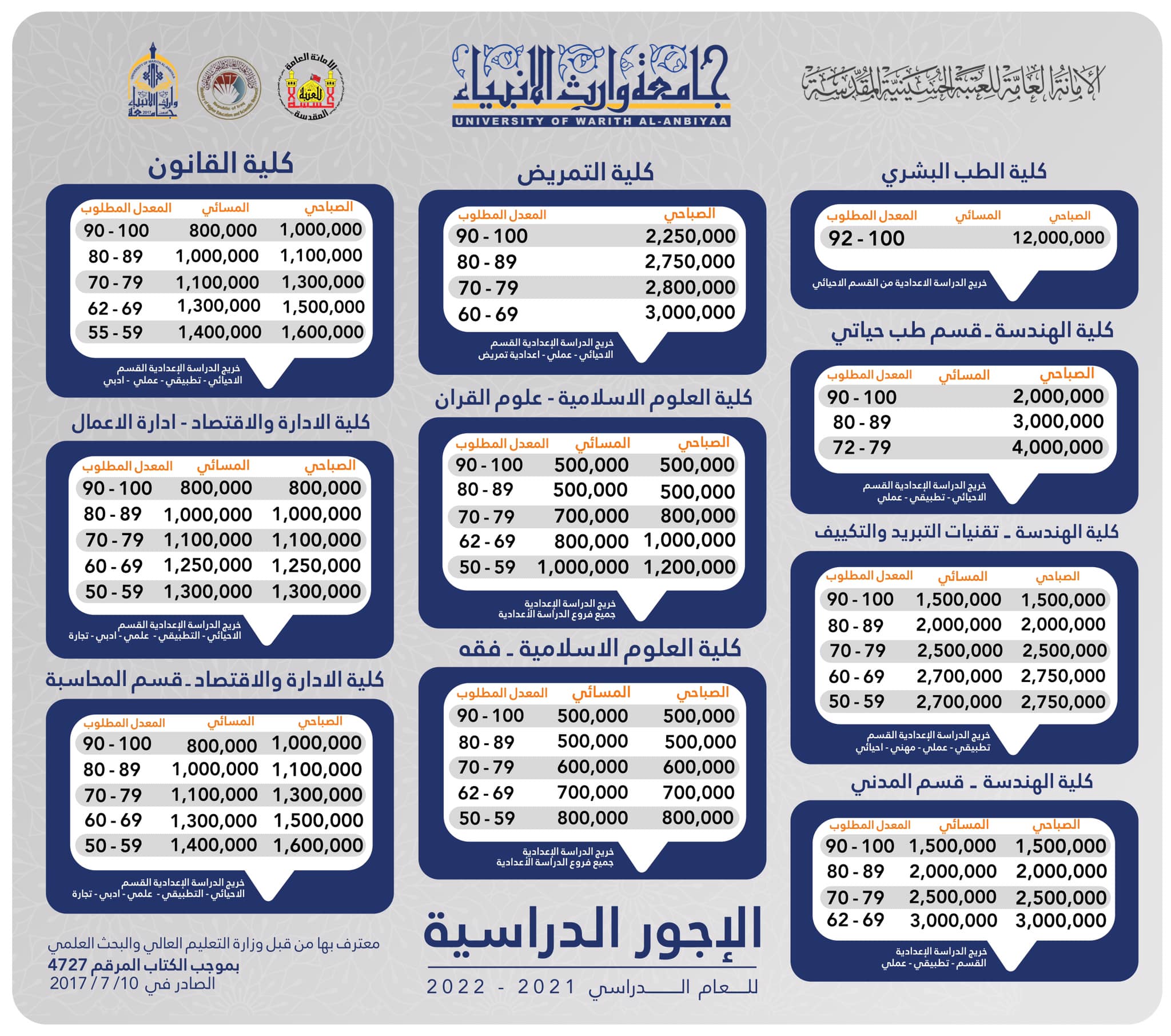 فرصة تعيين مركزي لاول ثلاثة طلبة على كل قسم من اقسام كلية العلوم الاسلامية في جامعة وارث الانبياء . تعلن كلية العلوم الاسلامية في جامعة وارث الانبياء التابعة للعتبة الحسينية المقدسة عن قرب فتح التقديم الى اقسامها الثلاثة : ● قسم علوم القران الكريم والتربية الاسلامية.● قسم الفقه واصوله ( مدرس وباحث اسلامي) ● قسم العلوم المالية والمصرفية الاسلامية ( محاسب في المصارف الحكومية والاهلية ) كما تعلن عن توفر تعيين مركزي للطلبة الثلاثة الاوائل على كل قسم في العتبة الحسينية المقدسة ...