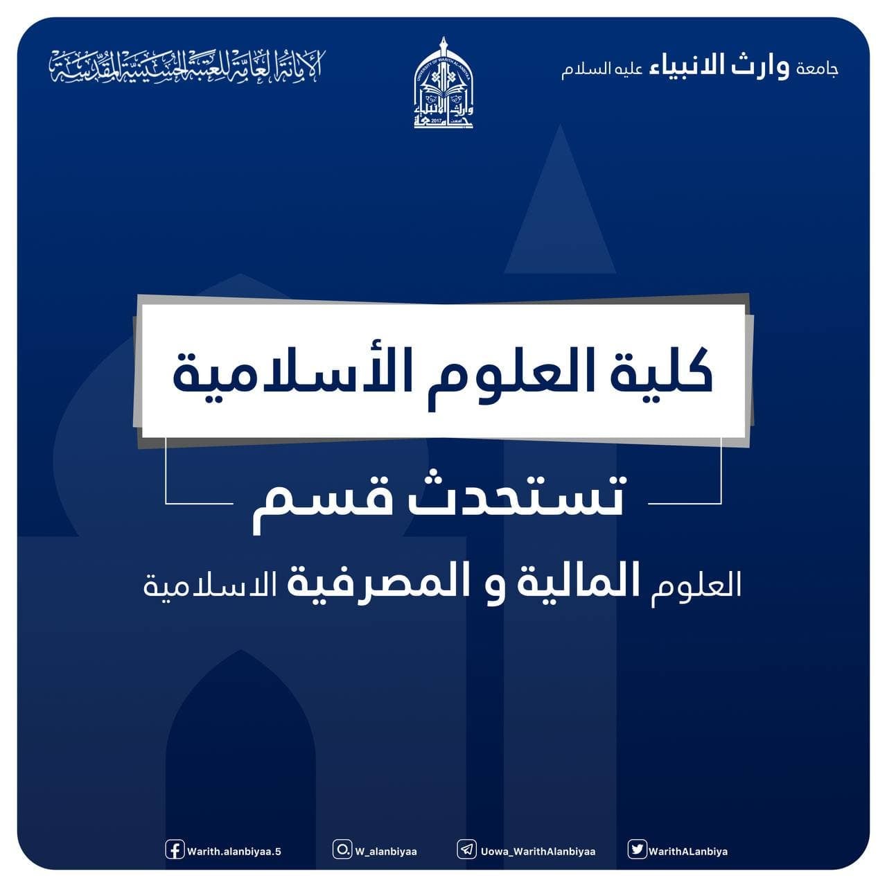 جامعة وارث الانبياء(عليه السلام) تستحصل موافقة وزارة التعليم العالي والبحث العلمي لاستحداث قسم العلوم المالية والمصرفية الإسلامية في كلية العلوم الإسلامية للدراسة الصباحية فقطيقبل القسم خريجي احيائي + تطبيقي + علمي + ادبي + وخريجي مراكز التدريب المهني الذي تكون مدة الدراسة فيها ثلاث سنوات الطلبة الذين ادوا الامتحان الوزاري في الاختصاص المناظر+الاعداديات الاسلامية التابعة للتربية(صباحي ومسائي) +الاعداديات الاسلامية التابعة للوقفين (الدراسة الصباحية طلبة الدراسة الخارجية (من ادو الامتحان التقويمي فقط))+ معهد اعداد معلمين (قسم الدراسة الاسلامية ، قسم اللغة العربية)