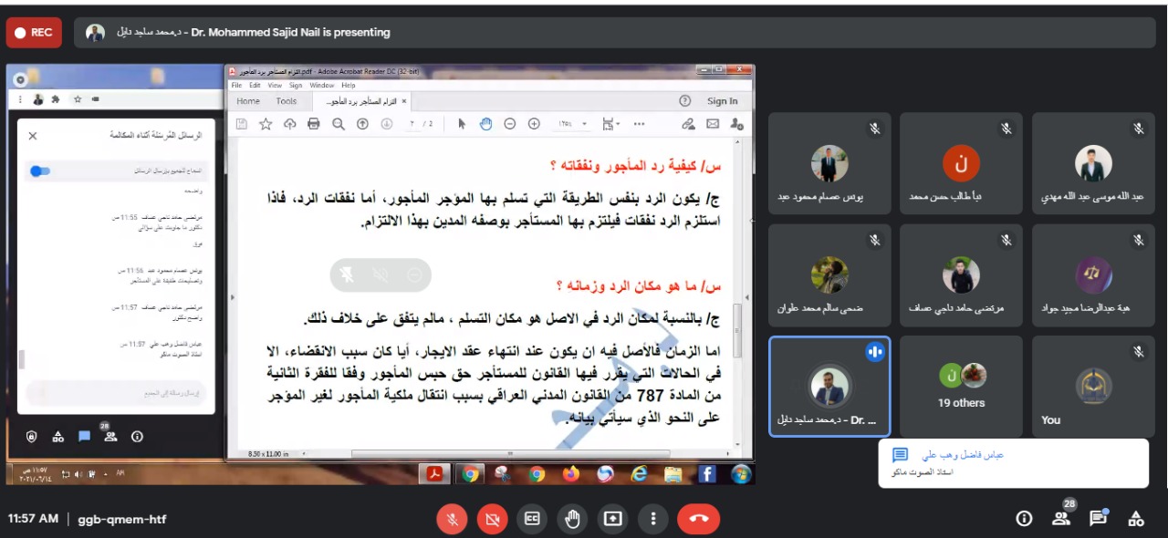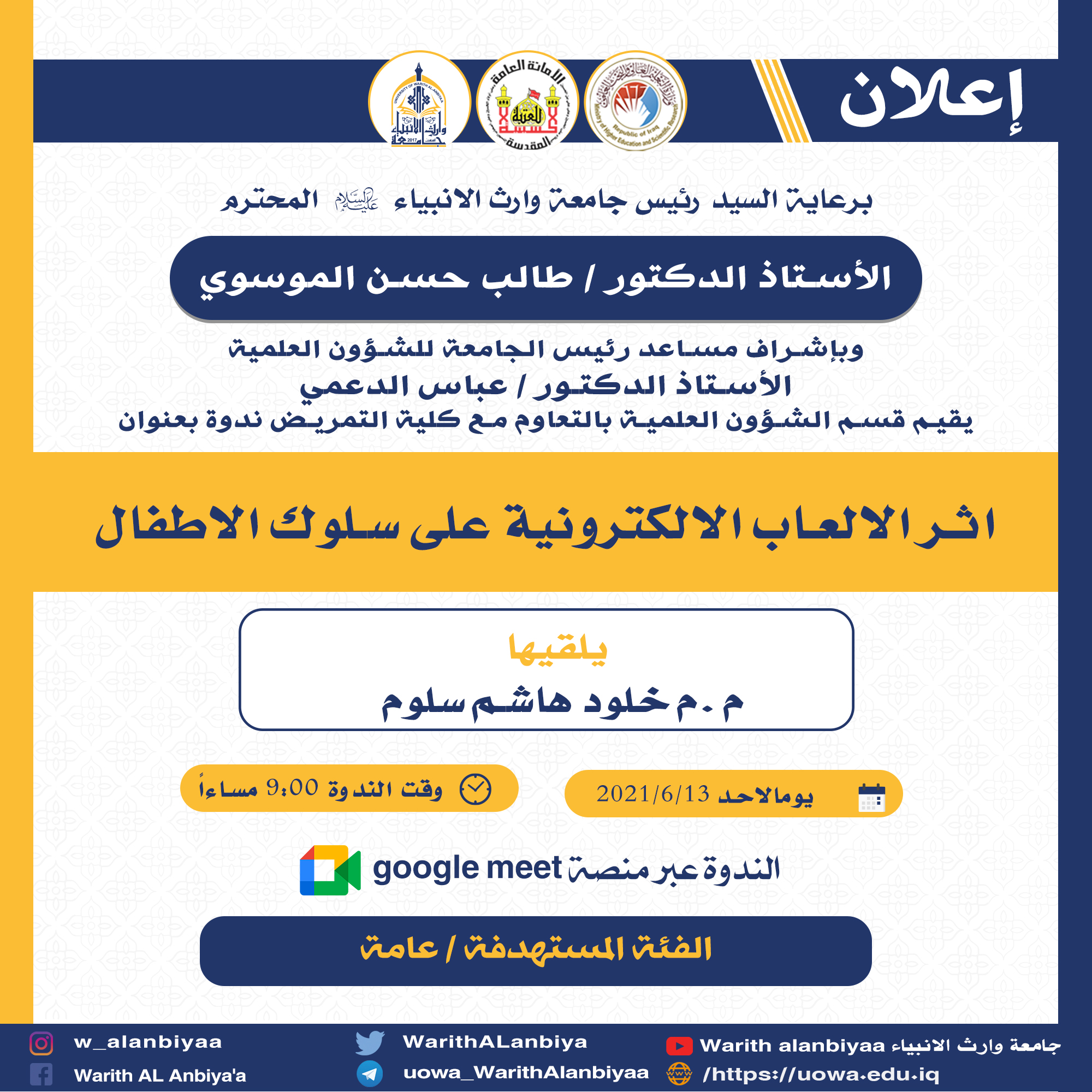 تقيم الشؤون العلمية في كلية العلوم الإسلامية / جامعة وارث الأنبياء ندوة علمية بعنوان ( القواعد القرآنية الحاكمة في العلاقات الإنسانية) يحاضر فيها الدكتور ( مصطفى جعفر الإبراهيمي) ومدير الجلسة الدكتور ( علي احمد ناصر) في يوم السبت الموافق ١٢ / ٦ /٢٠٢١ في تمام الساعة الثامنة والنصف مساء عبر منصة التعليم الإلكتروني الكوكل ميت