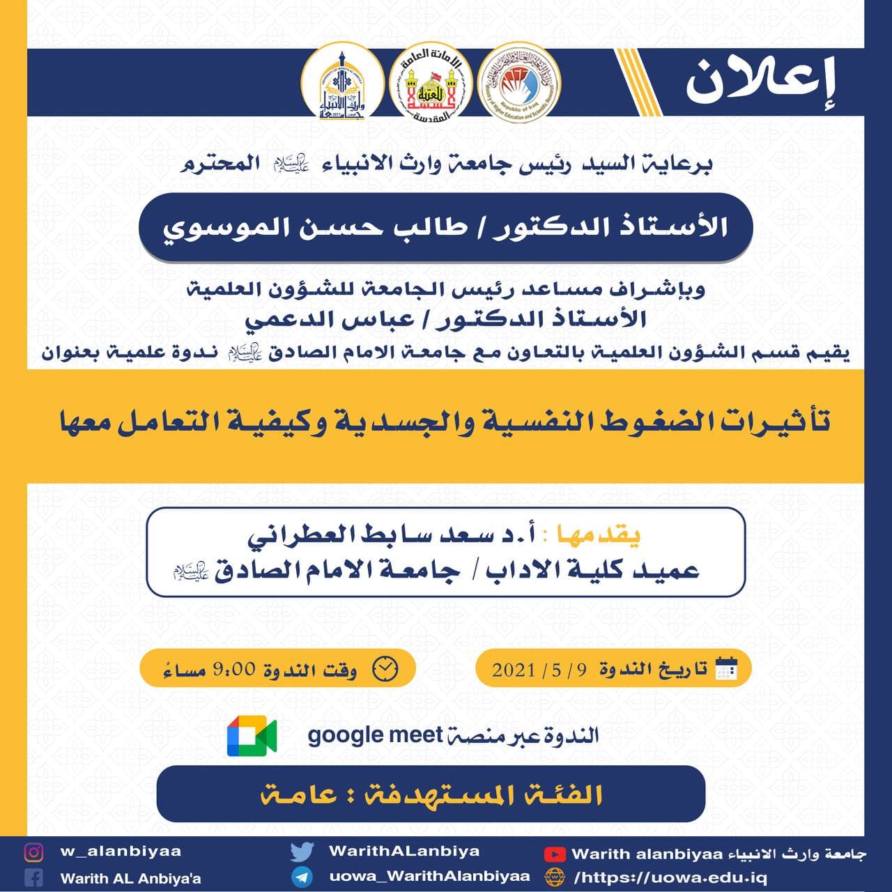 يقيم قسم الشؤون العلمية في جامعة وارث الانبياء(عليه السلام) ندوة علمية إلكترونية