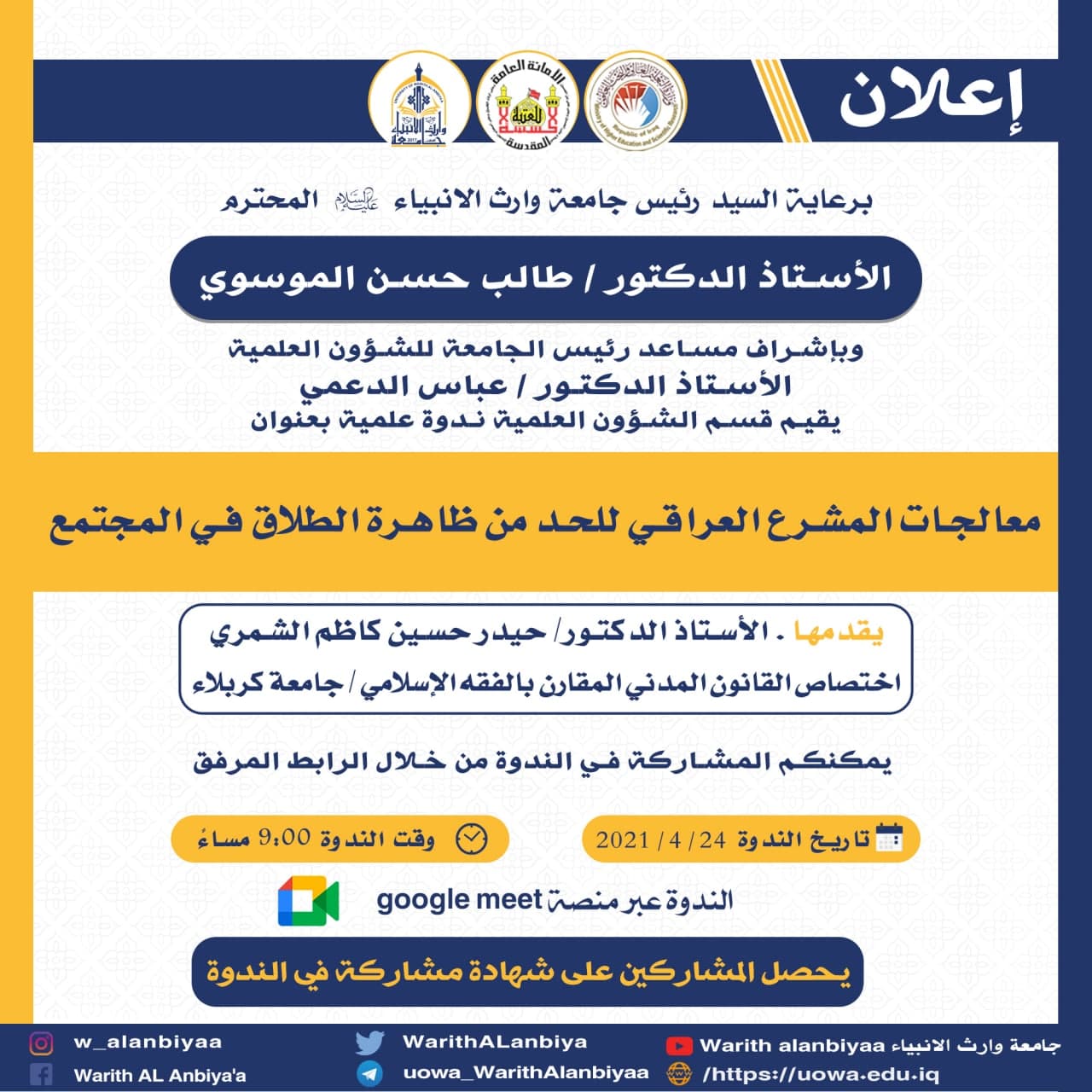 يقيم مركز التعليم المستمر في جامعة وارث الانبياء(عليه السلام) ندوة علمية إلكترونية عبر منصه التعليم الالكتروني الخاصه بالجامعة ومن خلال الرابط التالي:https://meet.google.com/iee-roxt-okq