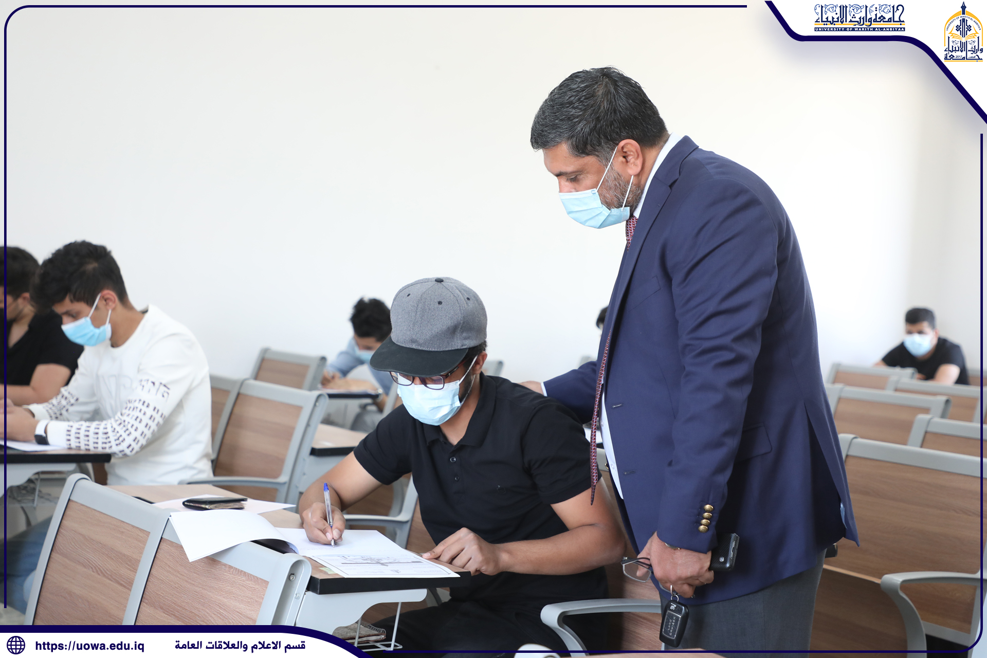جانب من القاعات الامتحانية لقسم التكييف والتبريد في جامعه وارث الأنبياء ليوم الثلاثاء المصادف ٦ / ٤ / ٢٠٢١ والذي يعكس صوره مثاليه لتطبيق التباعد الاجتماعي والالتزام بارتداء الكمامات تنفيذا لقرارات خلية الأزمة لمنع تفشي فيروس كورونا.