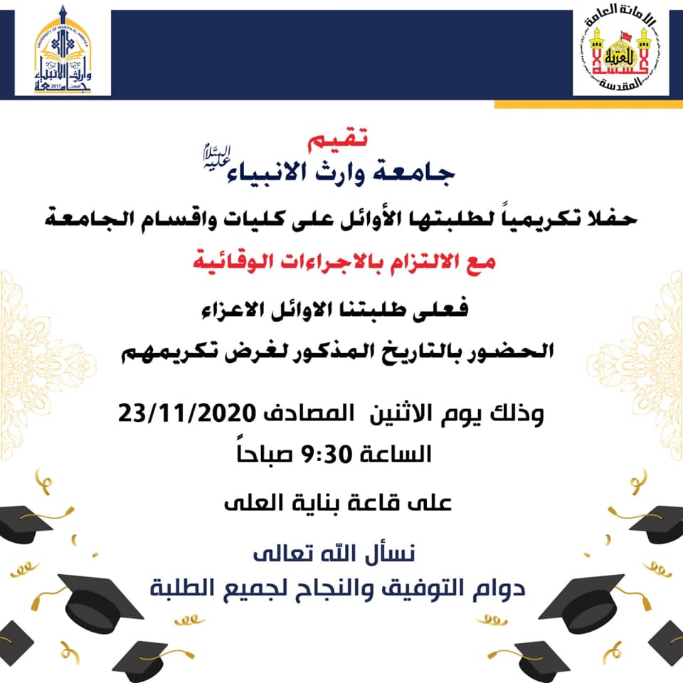 جامعة وارث الانبياء(عليه السلام) تهنئ طلبتها الأعزاء وتبارك لهم بدء العام الدراسي الجديد 2020-2021 ، مؤكدة على ضرورة الالتزام بالإجراءات الوقائية ، سائلين الله عز وجل ان يكون عاماً حافلاً بالإنجازات العلمية ولطلبتنا المزيد من النجاح والتفوق ، وان يبعد عنا الوباء والبلاء انه سميع مجيب .