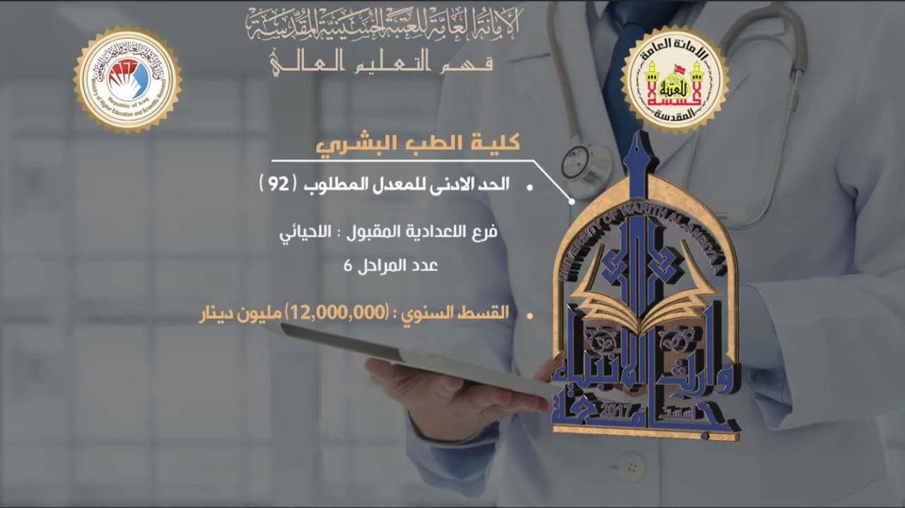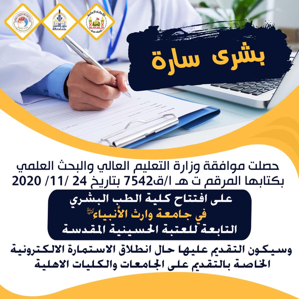 بدعم مباشر من قبل الامانة العامة للعتبة الحسينية المقدسة ، وبجهود مستمرة ومتابعة حثيثة من قبل قسم التعليم العالي فيها ، تزف جامعة وارث الانبياء(عليه السلام) الى الطلبة الأعزاء بشرى حصول موافقة وزارة التعليم العالي والبحث العلمي على استحداث