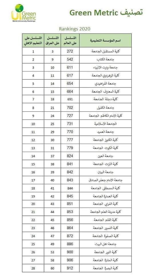 جامعة وارث الأنبياء(عليه السلام) تحصل على المرتبة الثالثة بالنسبة للجامعات الاهلية في التصنيف العالمي للجامعات (UIGreenMetric) بدعم مباشر ومتواصل من قبل الامانة العامة للعتبة الحسينية المقدسة متمثلة بقسم التعليم العالي وبتوجيه ورعاية من السيد رئيس الجامعة الاستاذ الدكتور طالب حسن موسى و متابعة خاصة من السيد المساعد العلمي الاستاذ الدكتور عباس الدعمي أثمرت الجهود المتميزة لوحدة التصنيفات العالمية في قسم ضمان الجودة والأداء الجامعي ولبقية الاقسام العلمية في الجامعة عن حصول الجامعة على المرتبة الثالثة بالنسبة للجامعات الاهلية والمرتبة العاشرة بالنسبة للجامعات الحكومية في التصنيف العالمي للجامعات (UIGreenMetric) ، نبارك لجامعتنا الحبيبة ولكوادرها التدريسية والادارية هذا الانجاز نحو التنصيفات العلمية العالمية .يذكر ان جامعة وارث الانبياء(عليه السلام) وبخطوات جدية تسعى للدخول في عدد من التصنيفات العالمية والمحلية سعياً منها للنهوض الجدي بالواقع العلمي في البلد .http://greenmetric.ui.ac.id/overall-rankings-2020/