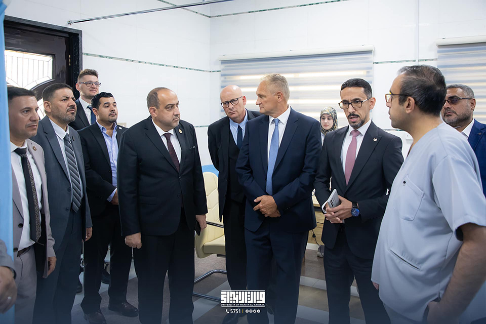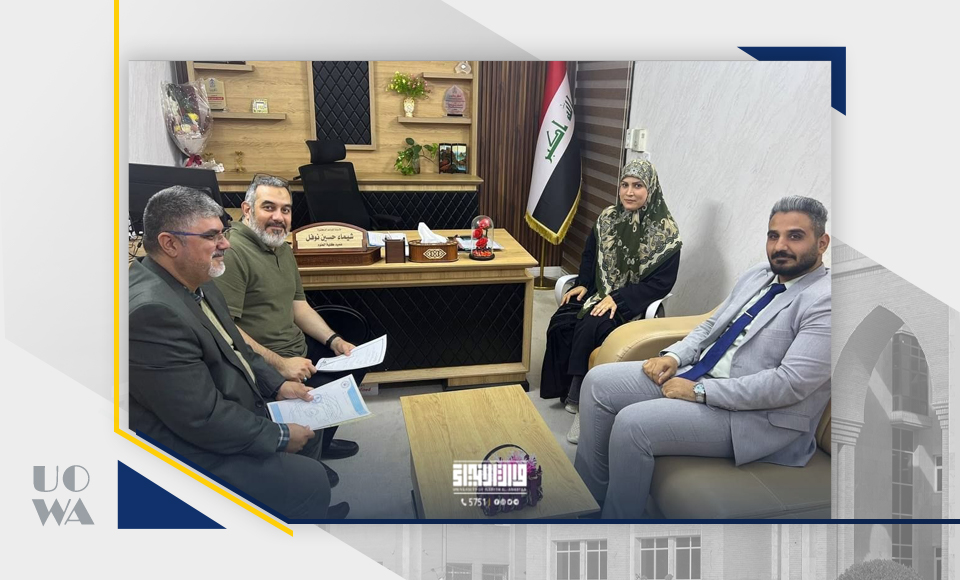The President of the University of Warith Al-Anbiyaa, Professor Dr. Ibrahim Saeed Al-Hayyawi, received a delegation from the Iraqi Syndicate for Training and Development, headed by Mr. Mohammed Al-Moussawi, who expressed his appreciation to the University Presidency for its active participation in the Syndicate’s conference held under the patronage of the Holy Shrine of Imam Hussain. He also commended the speech delivered by the University on behalf of the Shrine's Committee during the conference.