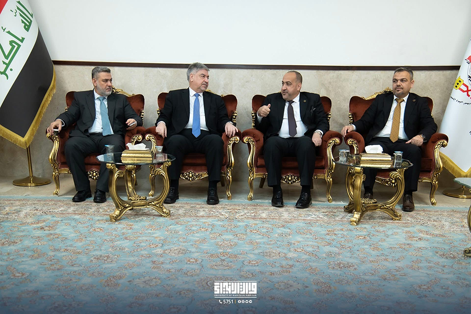 As part of its efforts to strengthen institutional cooperation with state institutions, the Presidency of the University of Warith Al-Anbiyaa received a high-level delegation from the Iraqi Ministry of Foreign Affairs, headed by the Deputy Minister for Political Planning, Dr. Hisham Al-Alawi. The delegation was welcomed by the University President, Professor Dr. Ibrahim Saeed Al-Hayyawi, accompanied by the Vice President for Scientific Affairs, Professor Dr. Waqed Al-Moussawi, and members of the University Council.