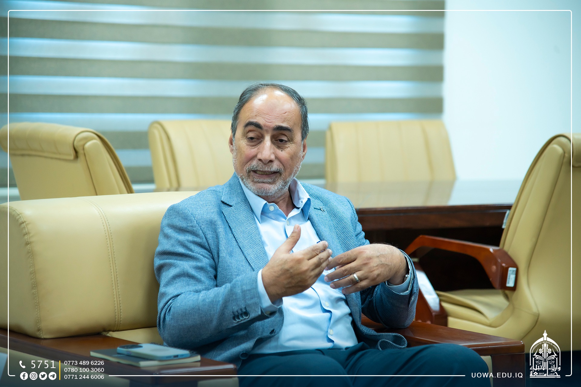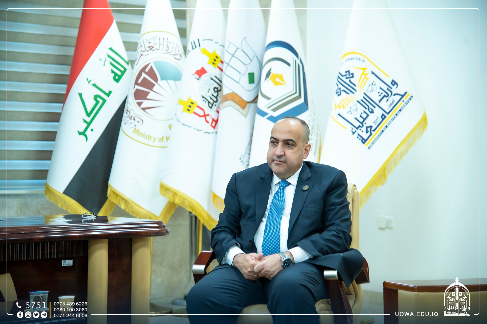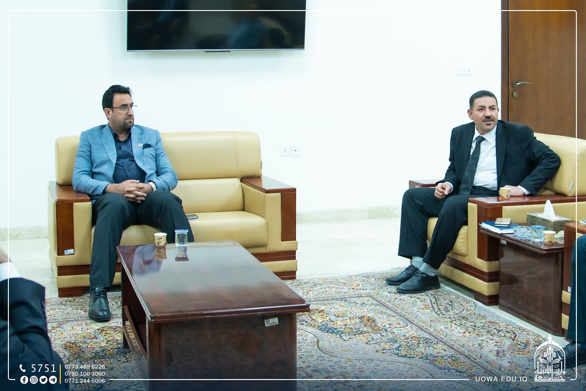 The University President, Professor Dr. Ibrahim Al-Hayawi, received a delegation from the College of Medicine at the University of Baghdad, led by the Dean of the College, Assistant Professor Dr. Ameen Abdul Hassan Al-Alwani. This visit was conducted to discuss the ways and possibilities of scientific cooperation between the College of Medicine at the University of Warith Al-Anbiyaa (peace be upon him) and the College of Medicine at the University of Baghdad in line with our university's vision and future aspirations to strengthen the educational process and benefit from the academic expertise that the College of Medicine at the University of Baghdad possesses to train and prepare our students. It is worth noting that the University of Warith Al-Anbiyaa (peace be upon him) is taking steps to keep up with the robust educational landscape by entering international rankings through partnerships and twinning with prestigious local, Arab, and international universities.