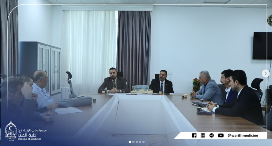 A meeting was held, chaired by Professor Dr. Ali Abdul Saadoun Al-Ghazi, Dean of the College of Medicine at Warith Al-Anbiya University (peace be upon him), with Dr. Mustafa Al-Shafi’i, Director of Al-Hindiya General Hospital. Also present were the Assistant Dean for Administrative Affairs, Dr. Anwar Sadiq Al-Dahhan, and the joint coordination committee from both sides. The meeting focused on discussing mechanisms for developing cooperation in clinical training and summer training for medical students.