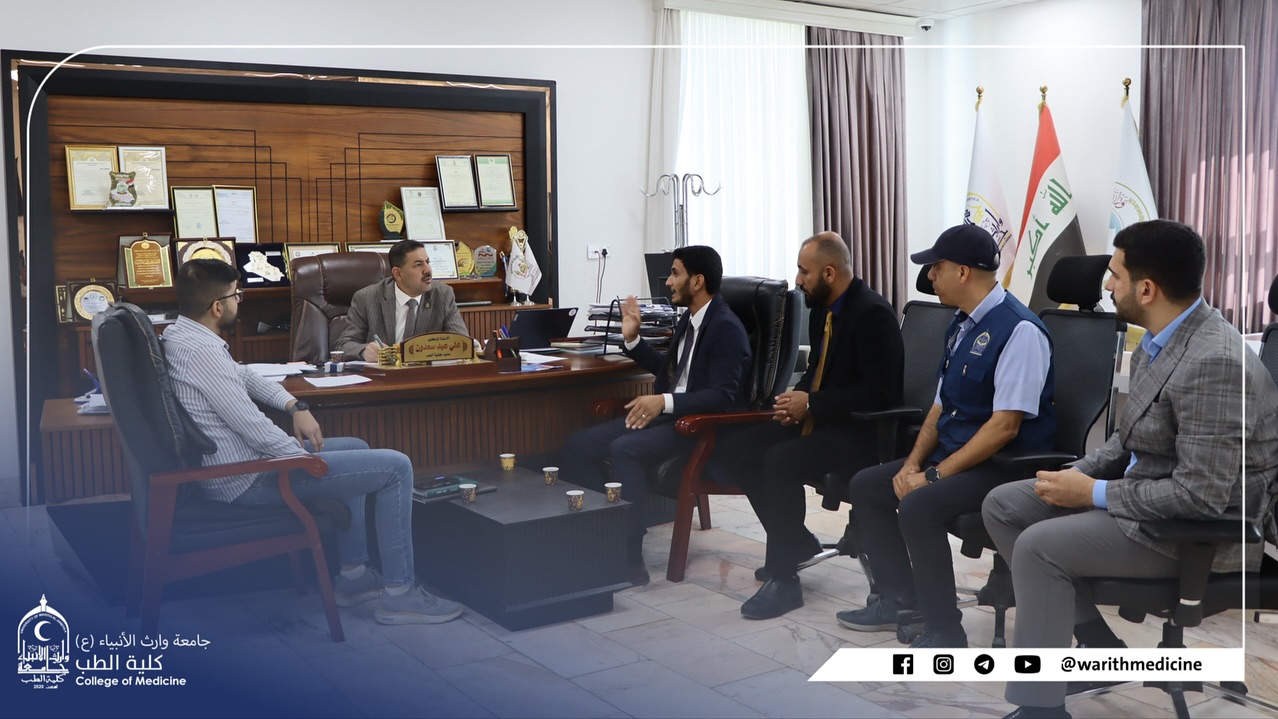 To follow up on the success of the TBL online exams, the Dean of the College of Medicine at Warith Al-Anbiya University, Professor Dr. Ali Abdul Saadoun Al-Ghazi, held a meeting with the Director of the Computer Center, department heads at the center, and the head of the college's Digital Department to discuss the progress and success of the online exams conducted using the Problem-Based Learning (TBL) system. The meeting addressed the evaluation of the technical performance in the exam halls, the efficiency of the electronic infrastructure, and the technical support mechanisms that contributed to the success of the experience.