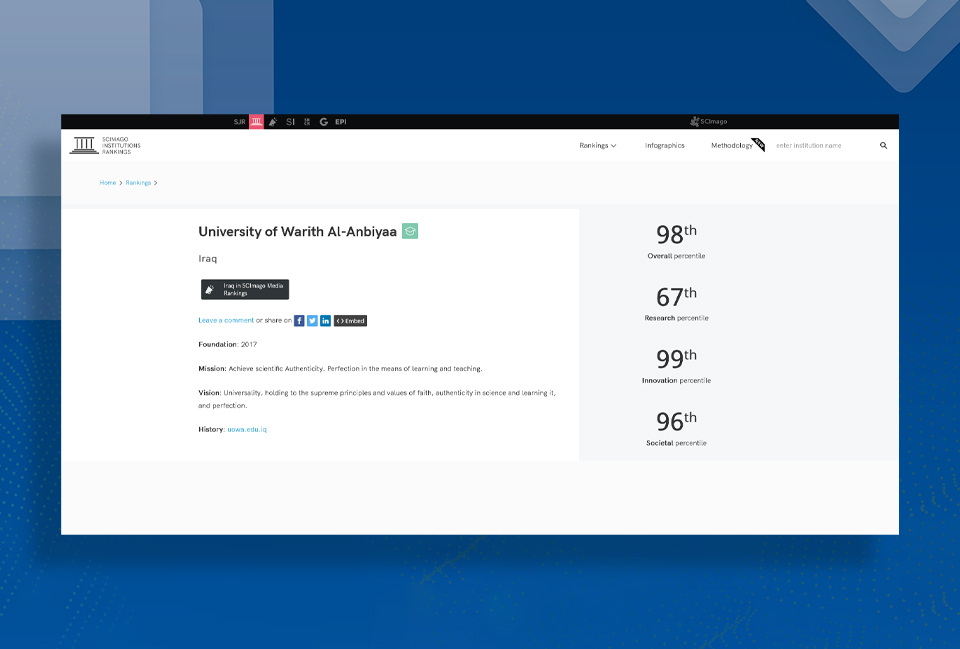 In a qualitative step reflecting its commitment to academic and research excellence, the University of Warith Al-Anbiyaa (Peace be upon him) celebrates its remarkable achievement in entering the Scimago Institution Rankings (SIR), one of the leading global rankings of research institutions. This accomplishment is the fruit of the university's continuous efforts to enhance qualitative scientific research and adopt effective strategies to support innovation and creativity. Managed by the Spanish National Research Council, the ranking primarily relies on rigorous criteria including research performance, innovation, and institutions' contribution to achieving sustainable development goals through serving the community. The University of Warith Al-Anbiyaa's entry into this ranking in a record time serves as strong evidence of the quality and impact of the research produced by the university on the international level. This achievement not only crowns the university's diligent work and strategic vision but also confirms its position as a leading center for scientific research that serves the community and contributes to sustainable development globally.