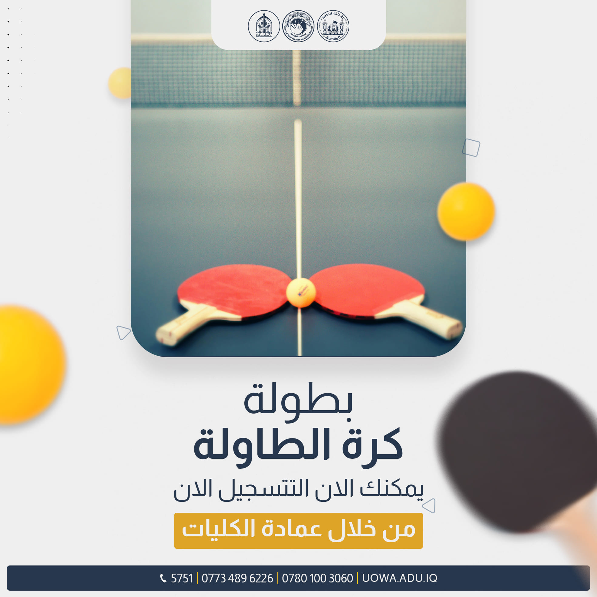 The Department of Student Activities at the University of Warith Al-Anbiyaa (peace be upon him) is organizing a table tennis tournament for students from all colleges and departments of the university. Those who wish to participate should contact the head of their department to register their name.