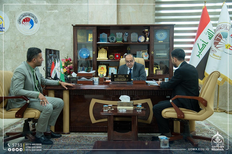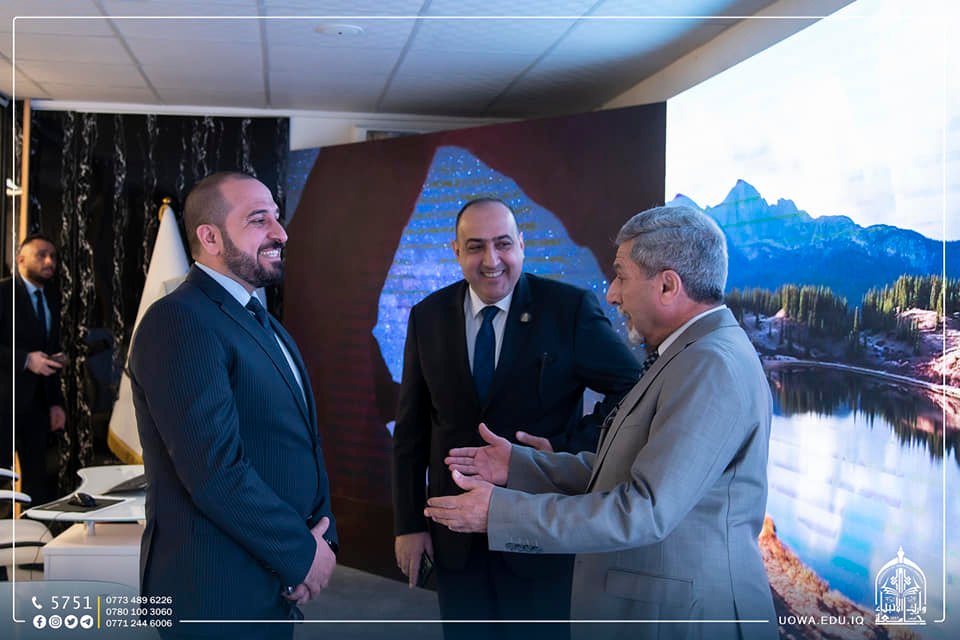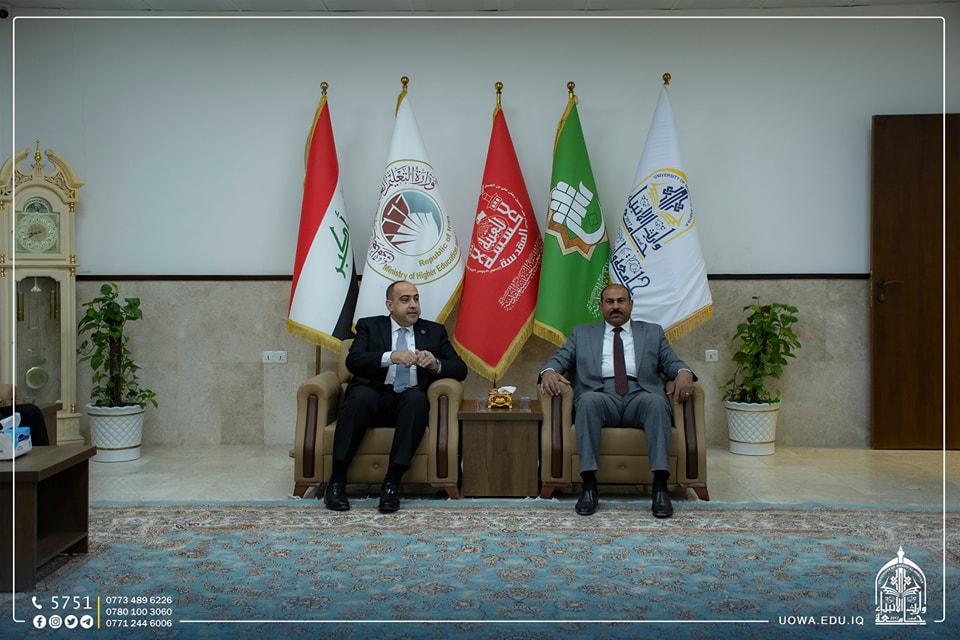 In execution of the terms of the scientific agreement between University of Warith Al-Anbiyaa and the Technological University, Professor Dr. Ibrahim Al-Hayawi, the President of the University, received a delegation from the Presidency of the Technological University, led by Professor Dr. Ahmed Al-Ghaban, the University President. This visit was aimed at enhancing the scientific collaboration between the two universities and monitoring the implementation of the agreement's provisions